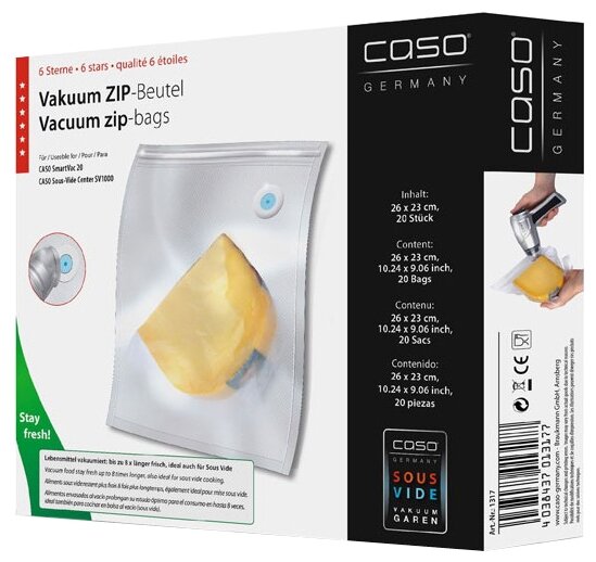Для использования с адаптером CASO ZIP (не входит в комплект), а также с CASO Vacu OneTouch. Чтобы продукты как можно дольше сохраняли свои питательные свойства, аромат, вкус и были пригодными для употребления в пищу, рекомендуется хранить их в вакуумных упаковках. Пакеты для вакуумирования Caso с ZIP-замком продлевают срок хранения продуктов за счет того, что в вакуумной среде резко снижается возможность развития вредных бактерий и микроорганизмов.