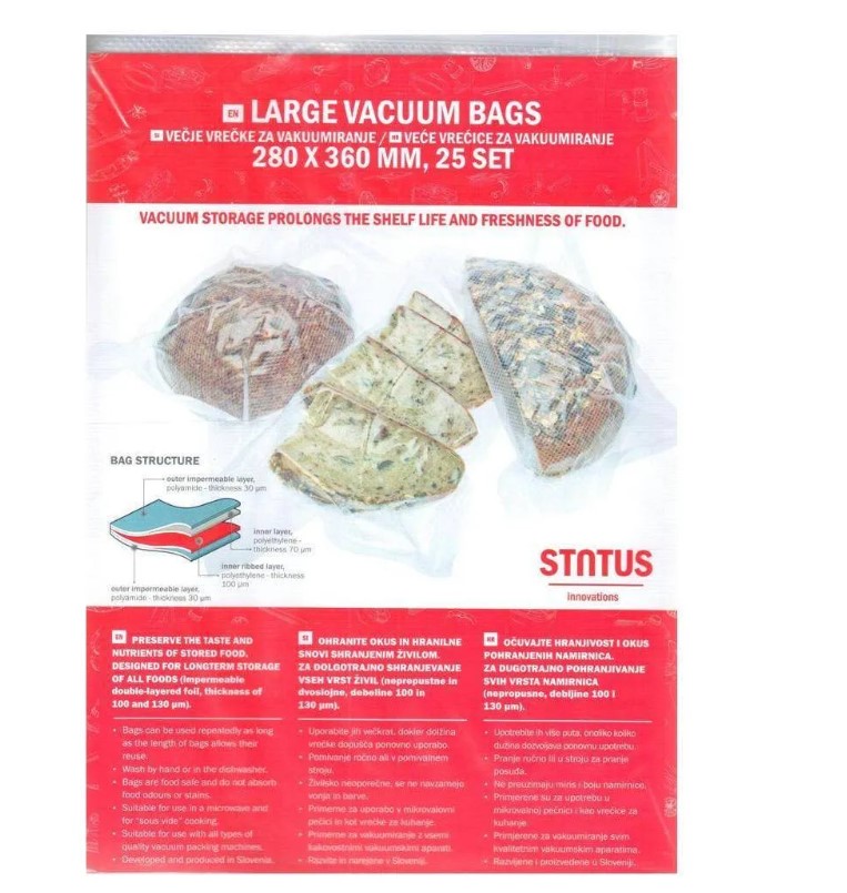 40 профессиональных пакетов размером 28 x 36 см для вакуумной упаковки. Ребристая внутренняя поверхность для оптимального вакуумирования. Высокая прочность пакета допускает замораживание, использование в СВЧ печи, готовку по технологии Sous-Vide.