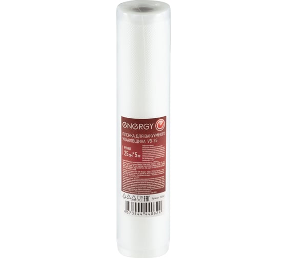 Пленка для вакуумного упаковщика ENERGY VB-25, 25х500 см 104562 в рулоне (рукав), рифленая. Использование вакуумной пленки помогает продлить срок хранения продуктов и готовых блюд. Пленка изготовлена из пищевого полиэтилена и полиамида, не выделяющих токсинов и запахов при высоких температурах и длительном нахождении рядом с едой.