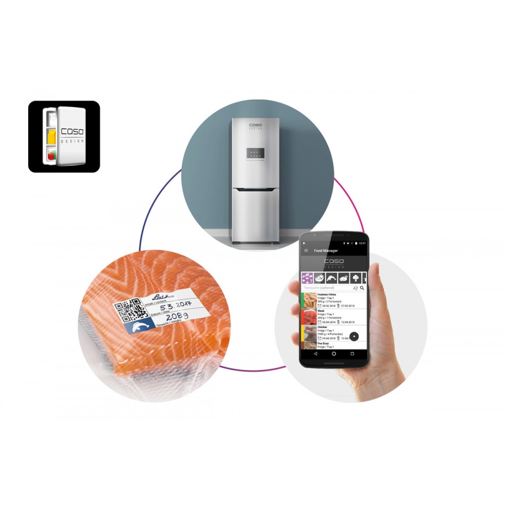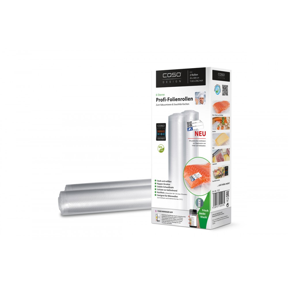 С рулонами для вакуумирования обеспечивается удобное хранение свежих овощей и фруктов, неиспользованных продуктов, полуфабрикатов, маринование мяса и рыбы, создание заготовок. В комплекте 2 рулона размером 28х600 см, а также стикеры с QR-кодом. При помощи приложения «Caso Food Manager» Вы всегда сможете контролировать количество продуктов в холодильнике, а также сроки их хранения.