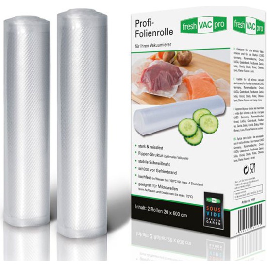 Рулоны для вакуумной упаковки Ellrona 2 x (20 x 600) 2 рулона профессиональной плёнки размером 20 x 600 см для вакуумной упаковки.