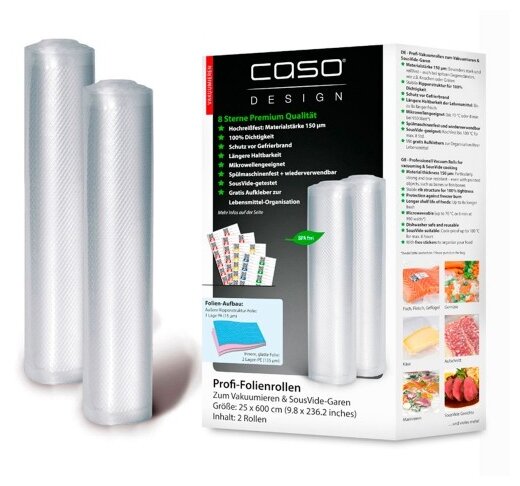 С рулонами для вакуумирования обеспечивается удобное хранение свежих овощей и фруктов, неиспользованных продуктов, полуфабрикатов, маринование мяса и рыбы, создание заготовок. В комплекте 2 рулона , а также стикеры с QR-кодом. При помощи приложения «Caso Food Manager» Вы всегда сможете контролировать количество продуктов в холодильнике, а также сроки их хранения.