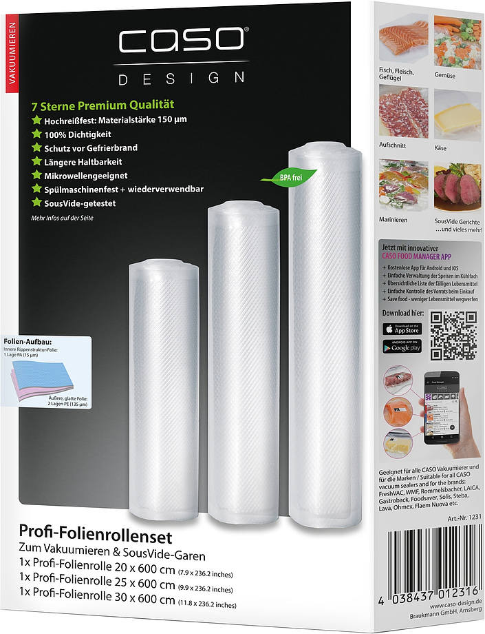 Набор вакуумных рулонов CASO 7 Sterne 20/25/30*600 используется совместно с бескамерными вакууматорами для упаковки продуктов в частных домах и квартирах, а также на предприятиях общественного питания и торговли для последующего их хранения или приготовления по технологии Sous Vide. Изделия выполнены из качественных пищевых полимеров, не содержащих бисфенол А.