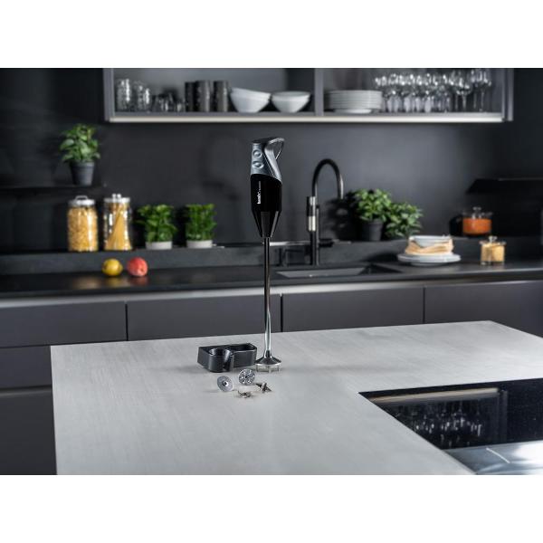 Черный погружной блендер Bamix Pro-3 (G350) произведен в Швейцарии. Работает в двух скоростных режимах с электромеханическим управлением. При работе прибора применяется импульсный режим. Особенность модели — удлиненная ножка. Состав комплектации: насадки для замешивания теста и смешивания, нож для взбивания и нож-измельчитель. Насадки сделаны из нержавеющей стали высокого качества, отличаются долговечностью и надежностью.