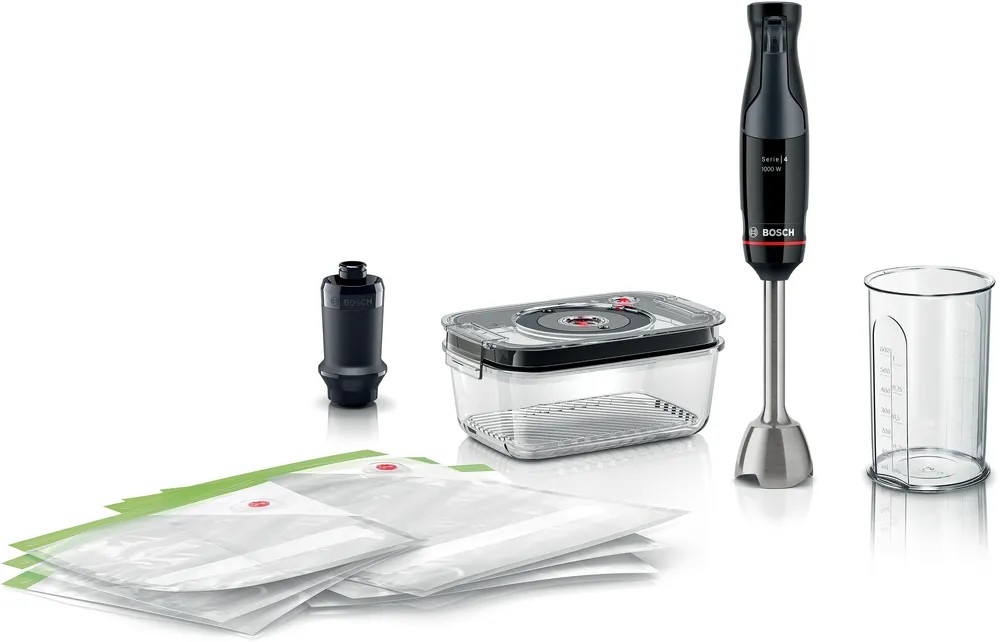 Устройство обладает эргономичной ручкой, которая обеспечивает удобный захват и уверенное управление. Бесступенчатая регулировка скорости позволяет выбирать оптимальный режим для каждого типа продуктов. Импульсный режим обеспечивает мощное и быстрое измельчение даже самых твердых продуктов. В комплекте с блендером поставляется мерный стакан, венчик для взбивания, вакуумный насос, вакуумный контейнер объемом 1.2 литра и вакуумные пакеты с замком. Все детали, подлежащие снятию, можно легко и быстро очистить в посудомоечной машине. Мощность блендера составляет 1000 Вт, что обеспечивает эффективное и быстрое измельчение продуктов.