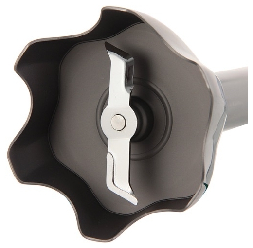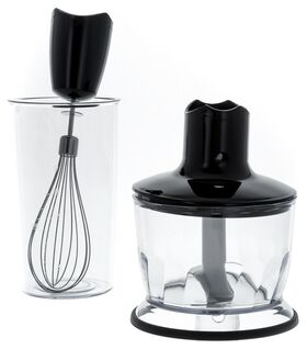 Погружная часть прибора выполнена из прочного долговечного металла. В комплектацию входят: мерный стакан объёмом 0.6 л, мельничка 0.5 л, венчик для взбивания жидких продуктов. Благодаря своим компактным размерам блендер не займёт много места на кухне.