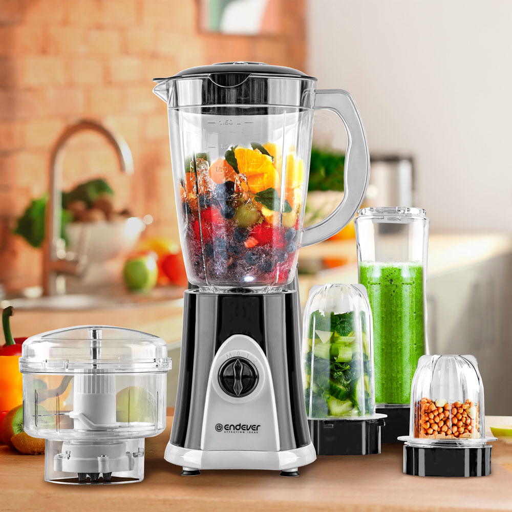 Эргономичный дизайн, Низкий уровень шума и вибрации, Защита от перегрева, Нож с четырьмя лезвиями, Материал ножей - нержавеющая сталь, Скорость вращения до 22 000 об/мин, Две скорости + импульсный режим, Плавная регулировка скорости, В комплекте чаша-измельчитель 600 мл, фитнес бутылка 600 мл, насадка-измельчитель 450 мл и насадка-кофемолка, вместимостью до 100 грамм кофейных зерен, для перемалывания зёрен кофе, приготовления небольших порций соусов, дробления орехов, измельчения специй и овощей, приготовления смузи и коктелей, Защита от случайного включения без чаши, Нескользящие ножки