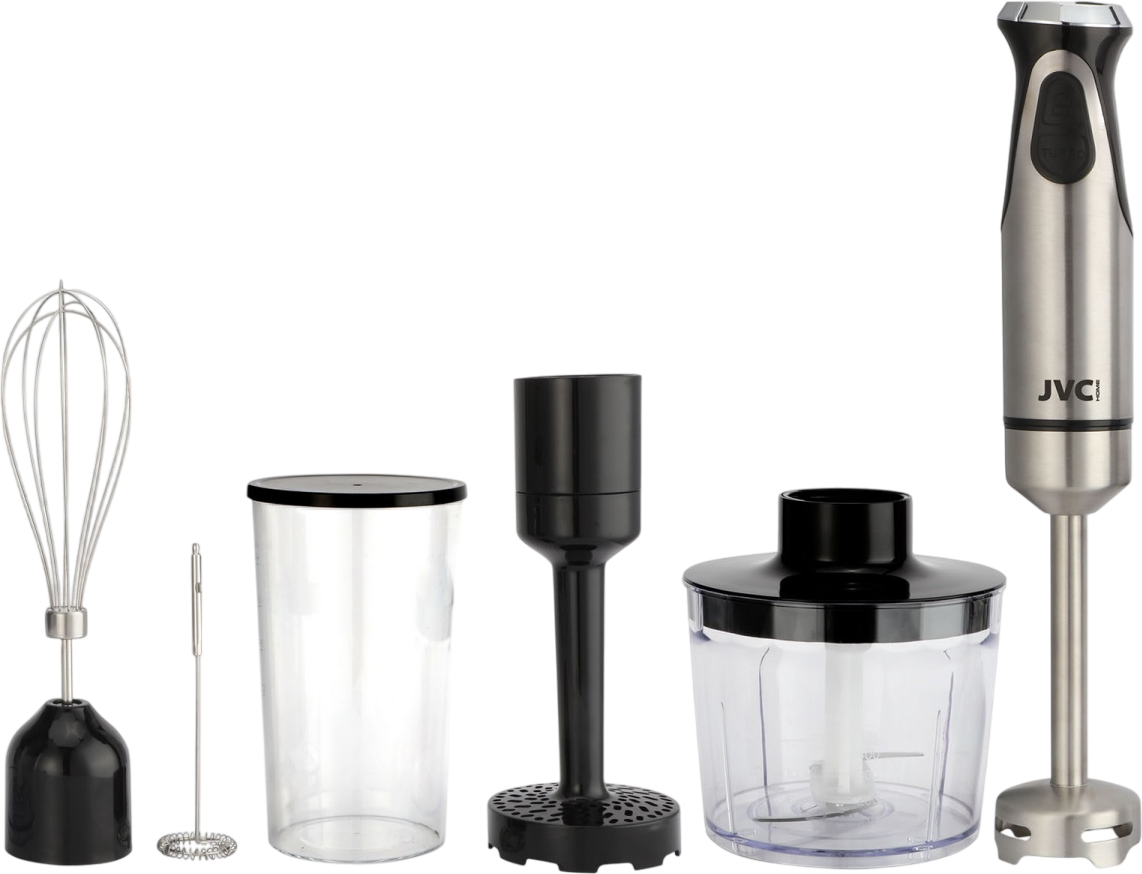 насадка-блендер (4 лепестка из нержавеющей стали), венчик, насадка для вспенивания молока, насадка для пюре, мерный стакан (0.7), крышка к стакану, измельчитель, чаша