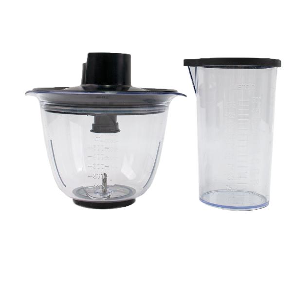 В комплект входят чаша для приготовления фарша и мерный стакан для смешивания с крышкой. Объем каждой ёмкости — 500 мл. Также предусмотрены 4 насадки: насадка для чистки чеснока, венчик для взбивания яиц, режущие ножи из нержавеющей стали и погружная насадка с ножами. В одном приборе возможно приготовить фарш для котлет, овощной крем-суп, фруктовый смузи, взбить яичные белки для крема.