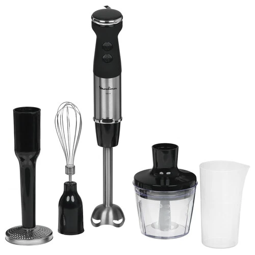 Блендер погружной Moulinex Quickchef+ DD674810 черного цвета благодаря мощности 1000 Вт может перемолоть замороженные фрукты, ягоды, орехи и лед. Скорость можно регулировать самостоятельно для увеличения интенсивности работы прибора. Прорезиненная ручка позволяет плотно удерживать модель в руке. С помощью мерного стакана объемом 800 мл можно точно отмерять необходимое количество ингредиентов. Съемные части блендера можно мыть в посудомоечной машине.