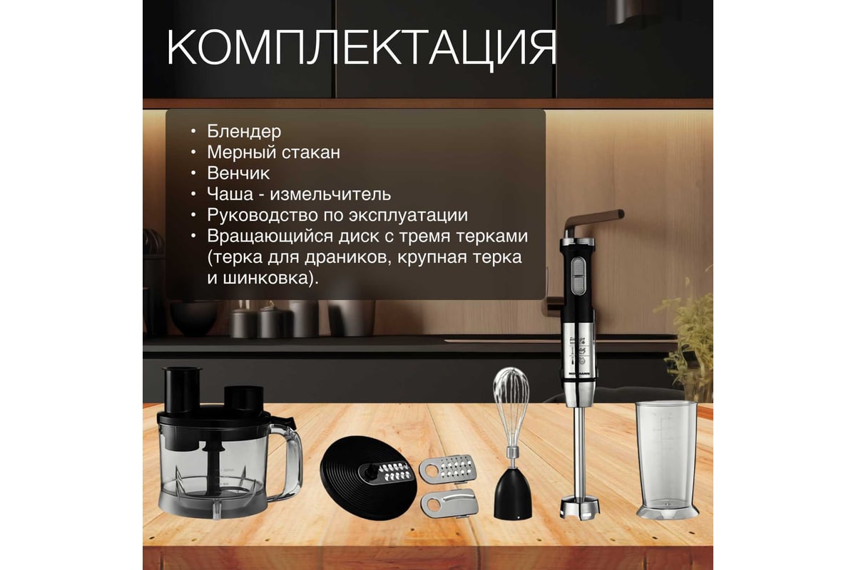 В комплекте идет мерный стакан 800 мл, венчик для взбивания и смешивания жидких продуктов, а также чаша кухонного комбайна 1,4 л и вращающийся диск с тремя терками (терка для драников, крупная терка и шинковка).