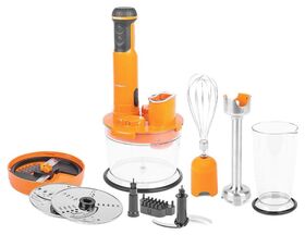 | Комплектация | насадка-блендер, кухонный комбайн - измельчитель, сменные диски для тёрки и шинковки – 2 шт, насадка для очистки решетки, мерный стакан 0.8 л, толкатель, венчик для взбивания, документация, насадка для нарезки кубиками |