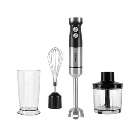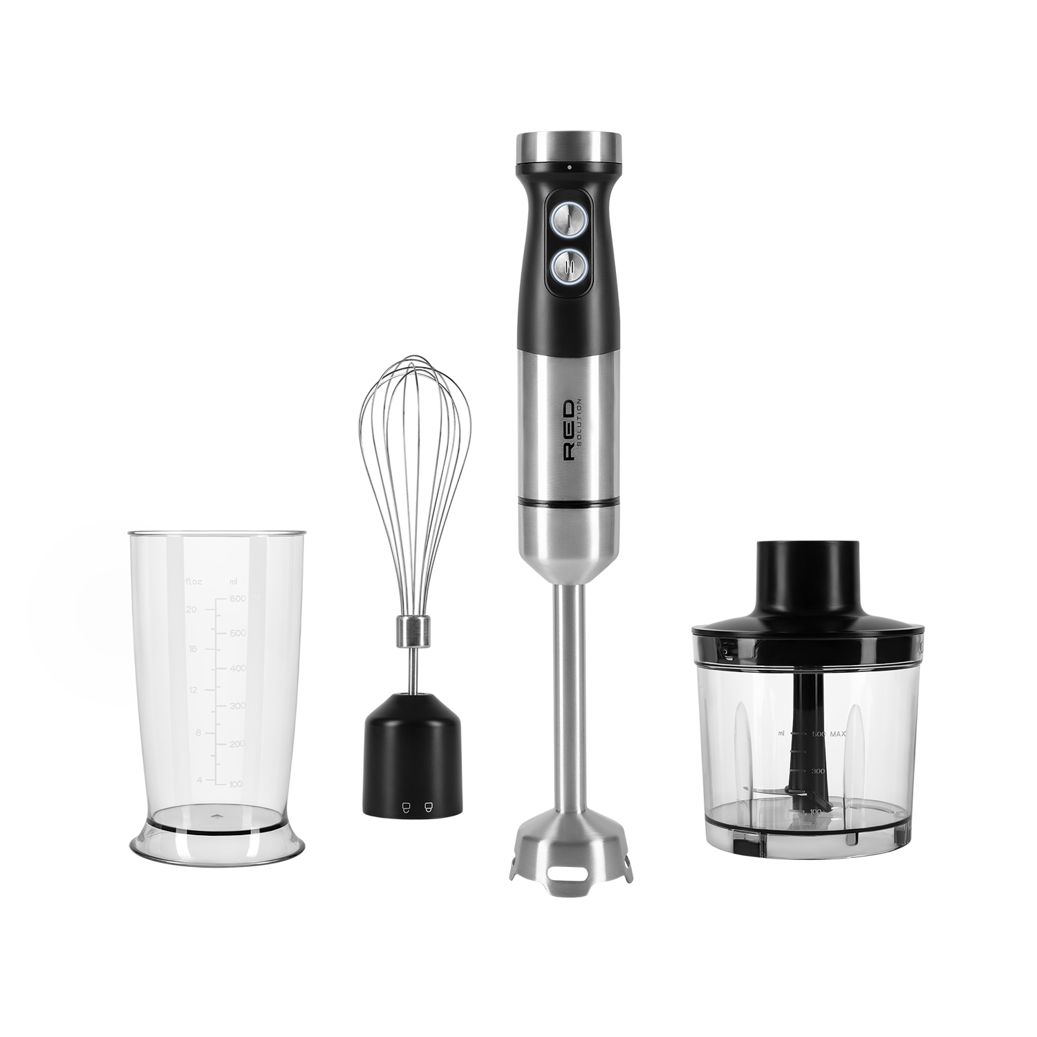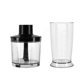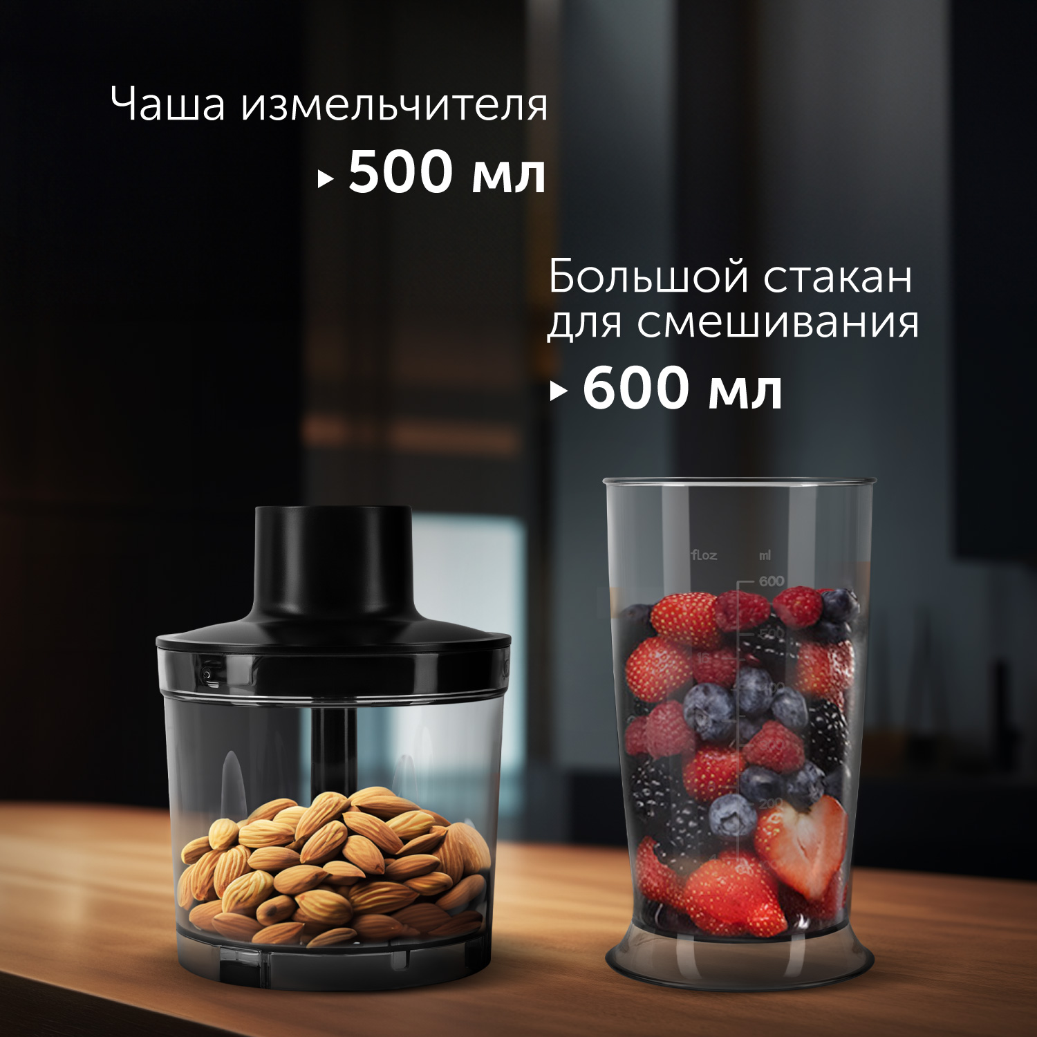 блок электродвигателя, S-образный нож, насадка-блендер, насадка-венчик, переходник для насадки-венчика, чаша измельчителя с крышкой, стакан для смешивания, руководство по эксплуатации