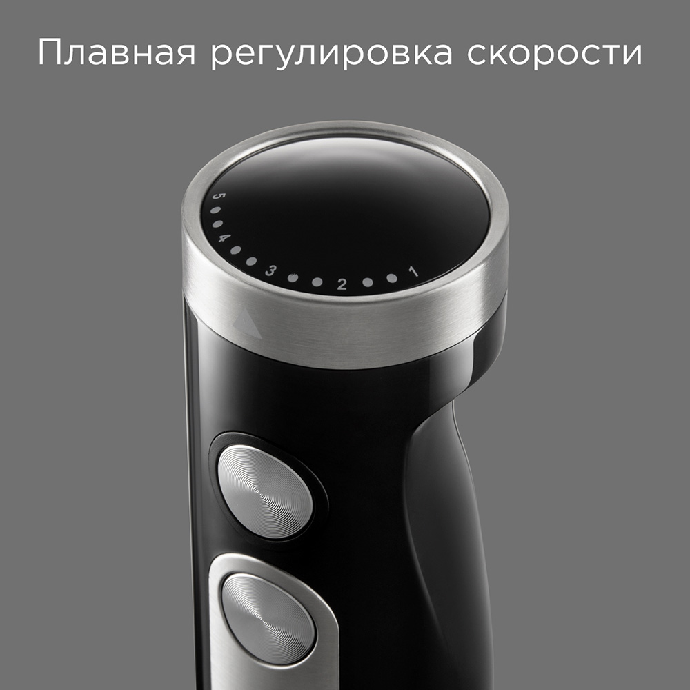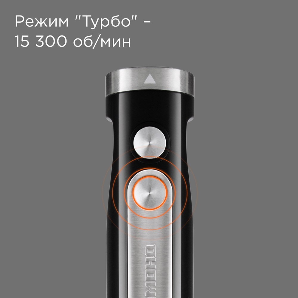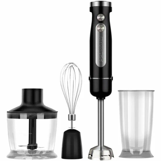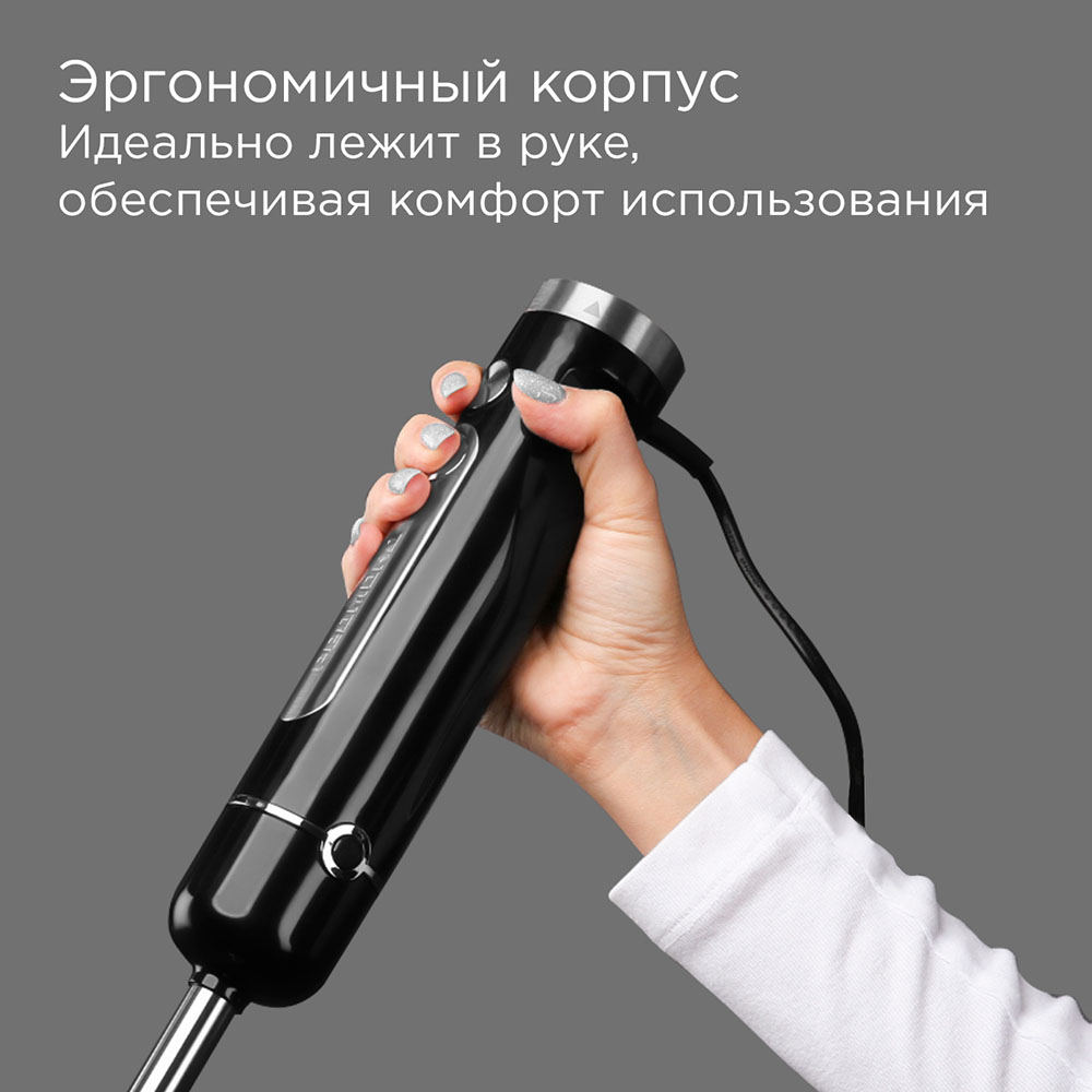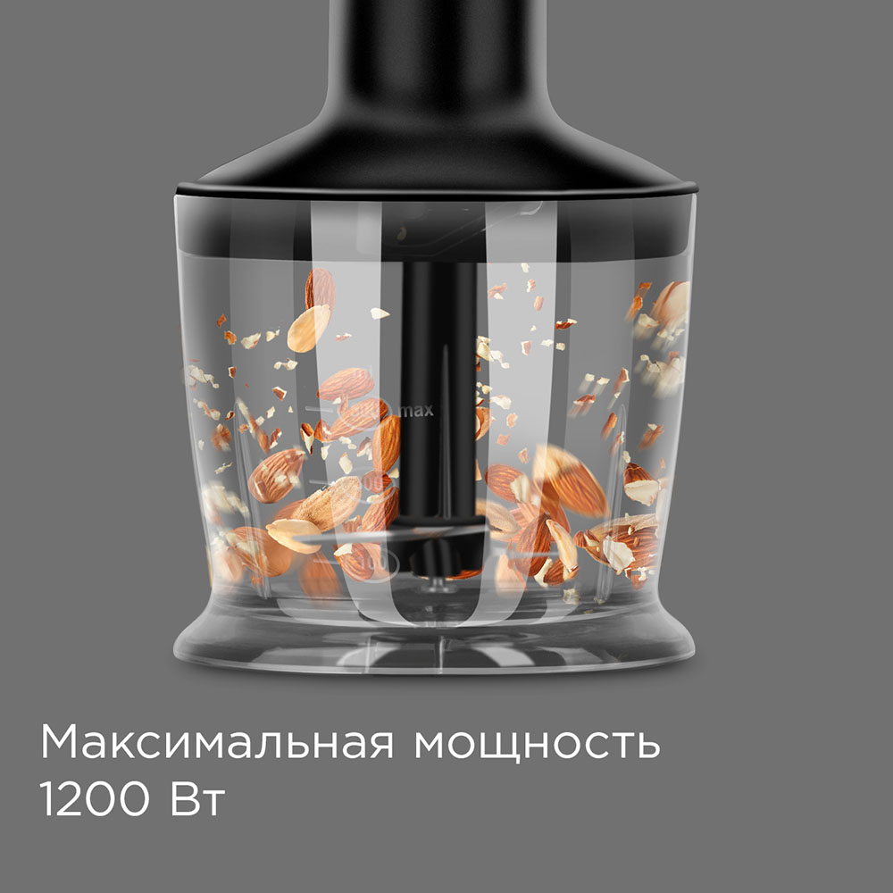 Комплектация: блок электродвигателя, чаша измельчителя с крышкой, насадка-блендер, насадка-венчик, переходник для насадки венчика, стакан для смешивания, S-образный нож, сервисная книжка, руководство по эксплуатации.