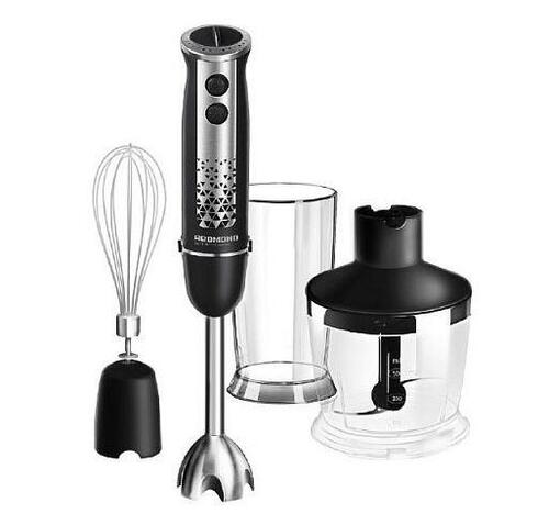 Комплектация сервисная книга, блок электродвигателя, насадка-венчик, насадка-блендер, стакан для смешивания, руководство по эксплуатации, чаша измельчителя с крышкой, переходник для насадки-венчика, S-образный нож