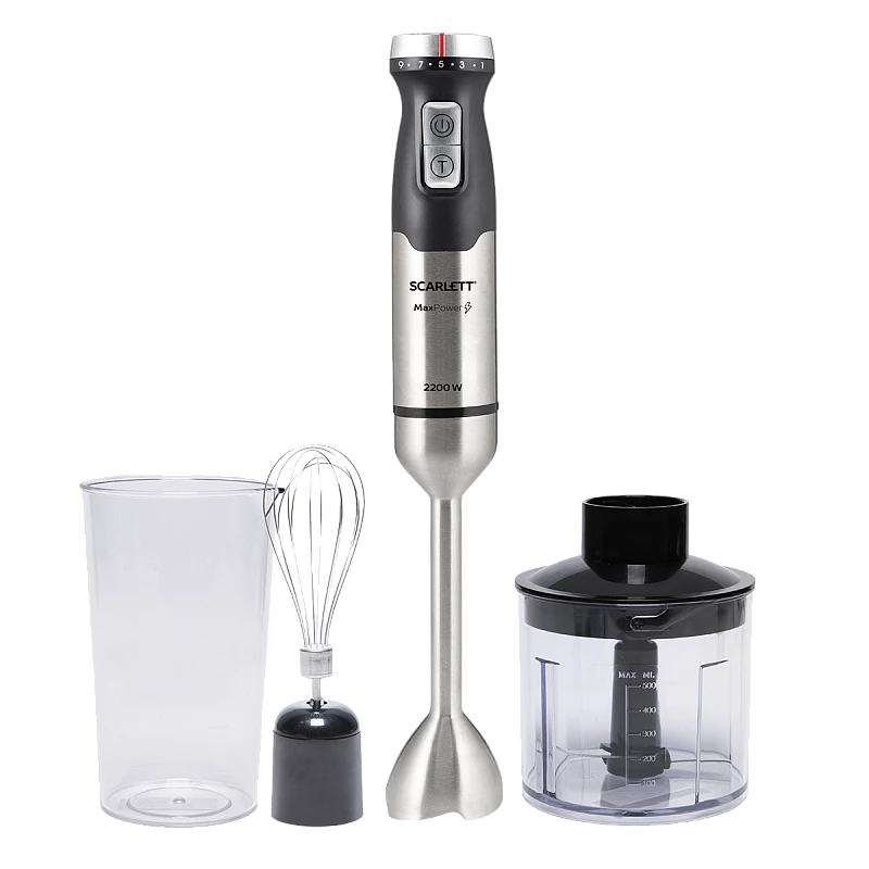 Scarlett SC-HB42F40 – погружной блендер 3 в 1, подходит для измельчения, взбивания и смешивания.