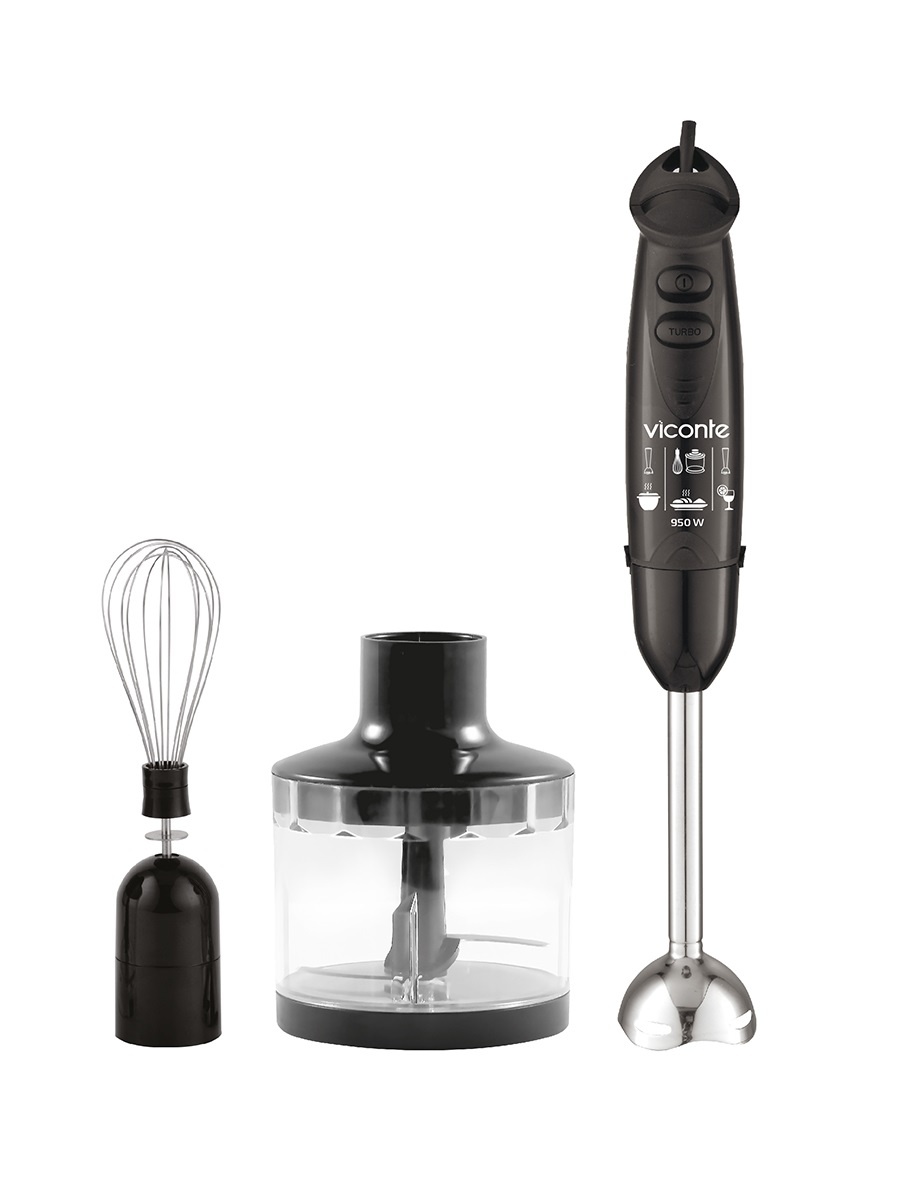 Погружной блендер, мощность 950 W, современный эргономичный дизайн, пульсовый режим работы, 2 скорости, лезвия из нержавеющей стали, металлическая нога блендера, венчик для взбивания, чаша с ножом для рубки и измельчения, 500 мл; автоматическая блокировка при неправильно установленной насадке, удобство и простота в обращении и чистке.