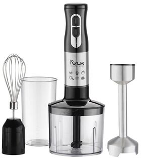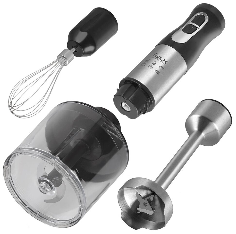 нержавеющая сталь; низкий уровень шума и вибрации; специальная форма погружной насадки предотвращает попадание брызг на рабочую поверхность; прорезиненная ручка; насадки можно мыть в посудомоечной машине