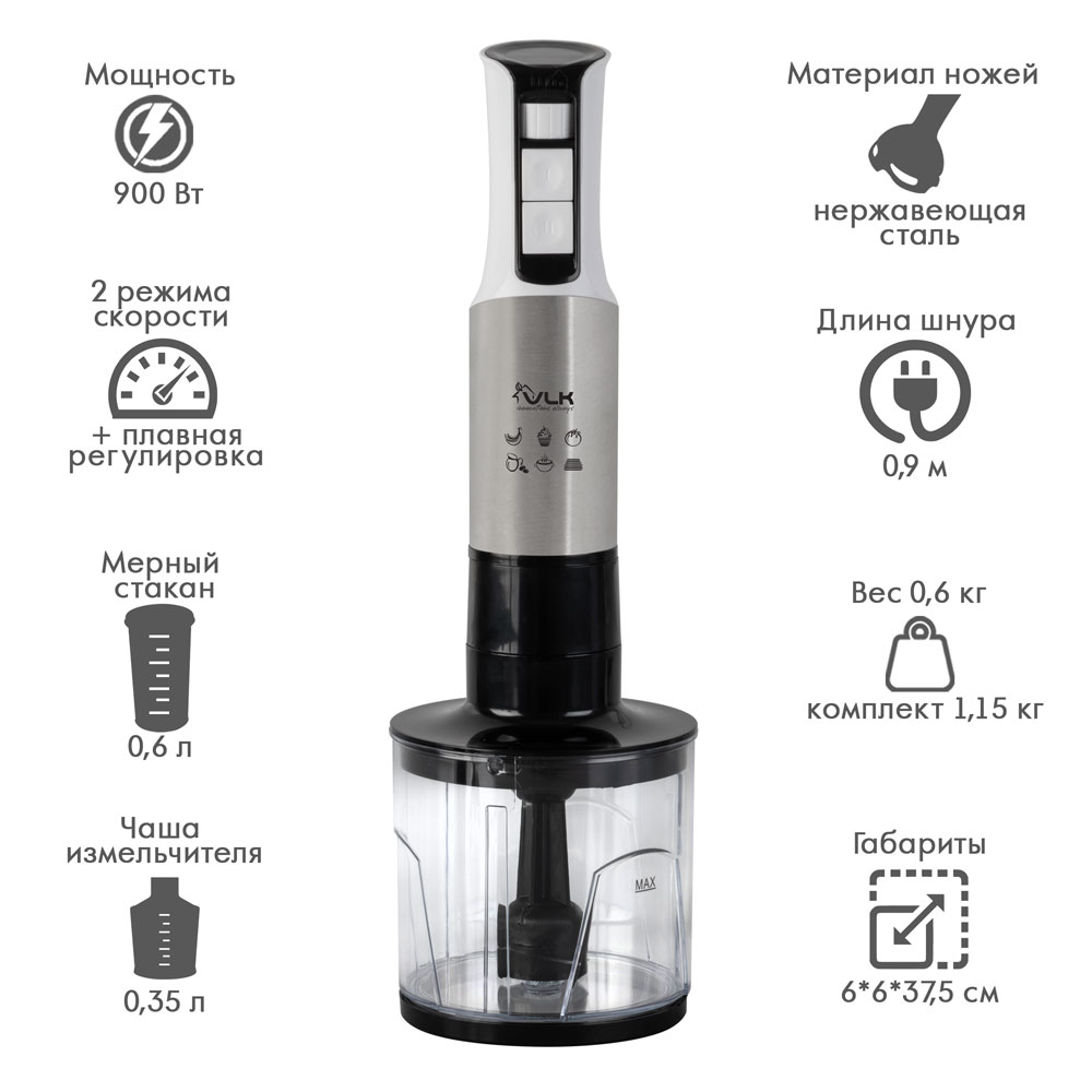Два режима скорости + плавная регулировка скорости, Специальная форма погружной насадки предотвращает попадание брызг на рабочую поверхность, Эргономичный дизайн, Низкий уровень шума и вибрации , Материал ножей: нержавеющая сталь, Снятие насадки одним легким движением, Скорость вращения ножей до 15500 об/мин, Защита от перегрева мотора, Дополнительный комплект аксессуаров