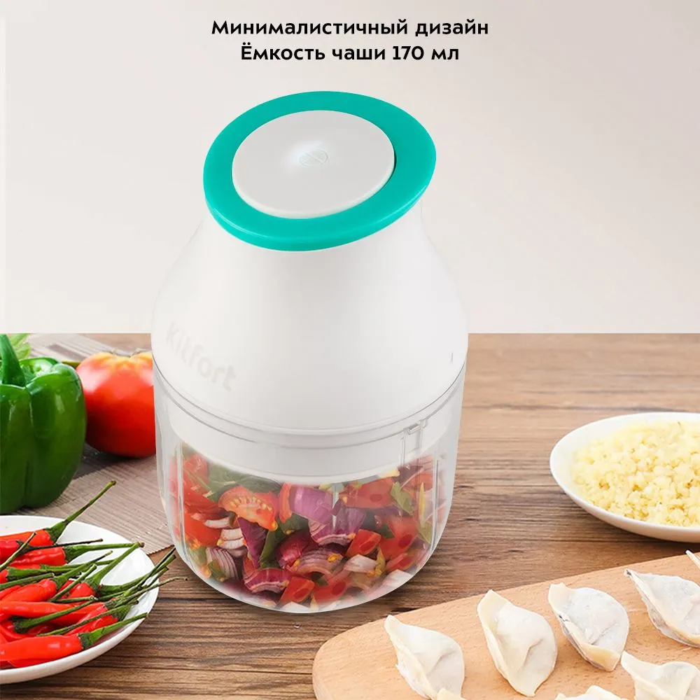 Портативный измельчитель - прибор для быстрого измельчения мяса, твердого сыра, овощей, трав, чеснока, ягод и других продуктов. Чаша ёмкостью 170 мл изготовлена из прозрачного пластика, вы можете легко контролировать степень измельчения.