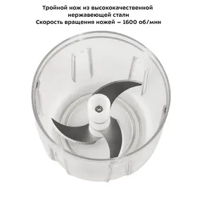 Тройной нож измельчает ингредиенты практически по всей высоте чаши. Лезвия изготовлены из высококачественной нержавеющей стали, скорость вращения ножей измельчителя - 1600 об/мин. Любимое блюдо будет готов за считанные минуты!