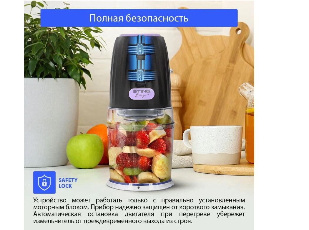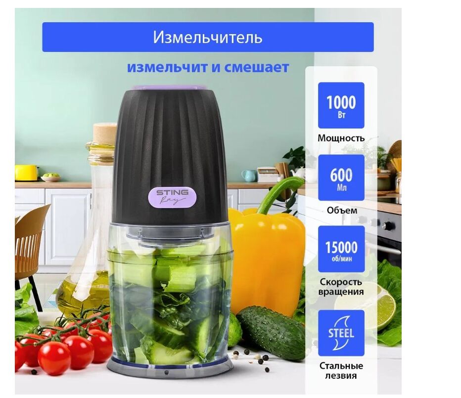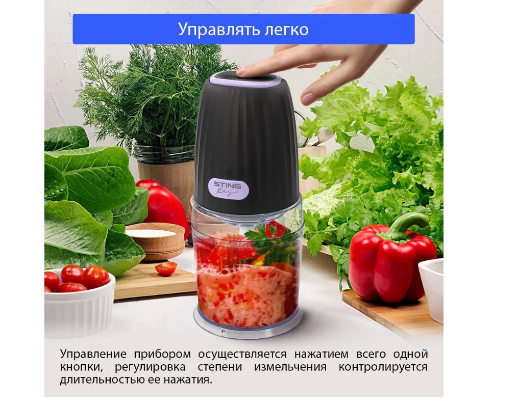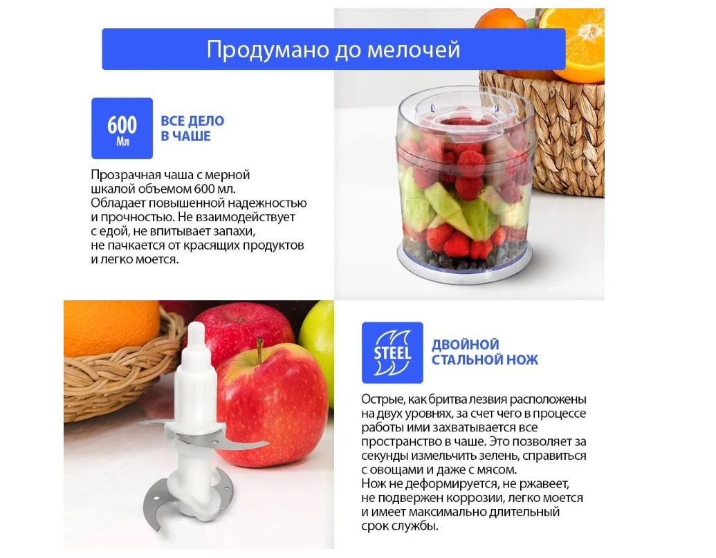 Мощный измельчитель с пластмассовой чашей объемом 600 мл и одним скоростным режимом. Подходит для измельчения, взбивания, смешивания. 2 съёмных ножа из нержавеющей стали не деформируются, не ржавеют, не подвержены коррозии, легко моются и имеют максимально длительный срок службы. Прибор имеет кнопку управления, удобен и прост в использовании, занимает при хранении немного места.