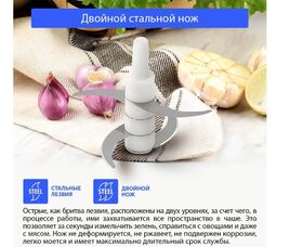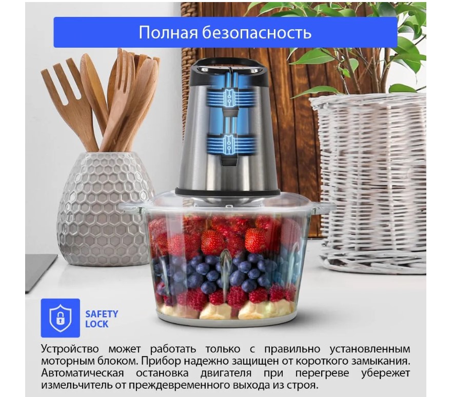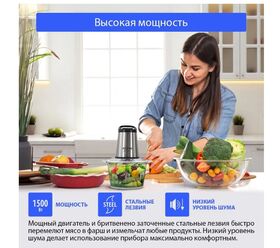 Мощный измельчитель со стеклянной чашей объемом 1,8 литра и двумя скоростными режимами. Подходит для измельчения, взбивания, смешивания. 4 съёмных ножа из нержавеющей стали не деформируются, не ржавеют, не подвержены коррозии, легко моются и имеют максимально длительный срок службы. Прибор удобен и прост в использовании, занимает при хранении немного места. Емкость чаши 1,8 л позволяет готовить на всю семью.