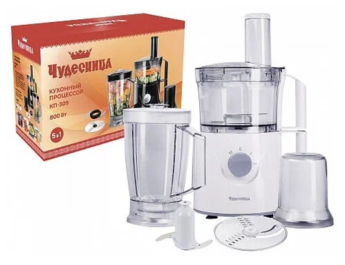 Кухонный процессор Чудесница КП-309Б. Максимальная мощность 800 Вт. Электропитание 220-240 В 50 Гц. 2 скорости + режим "Pulse". Регулировка скорости. Измельчитель 1.2 л, блендер 1.5 л, овощерезка. Диск для шинковки. Диск для картофеля фри. Насадка для замешивания теста. Универсальный нож. Эмульсионный диск для соусов и майонеза. Материал ножей нержавеющая сталь. Защитный замок.