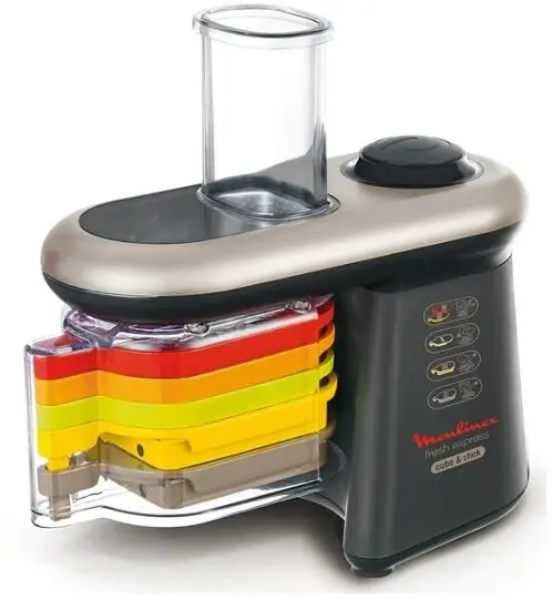 - вставка для крупной терки; - вставка для мелкой терки; - вставка для шинковки; - вставка для нарезки тонкой соломкой; - вставка для нарезки кубиками; - толкатель; - щетка для чистки.