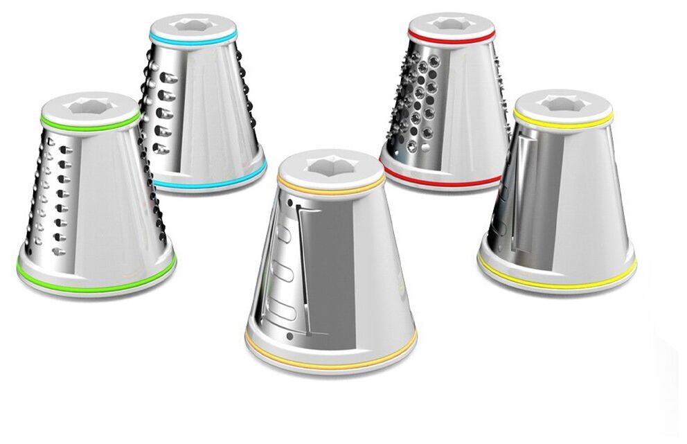 терка: 1 в комплекте, насадка для нарезки ломтиками: 4 в комплекте, общее число насадок: 5