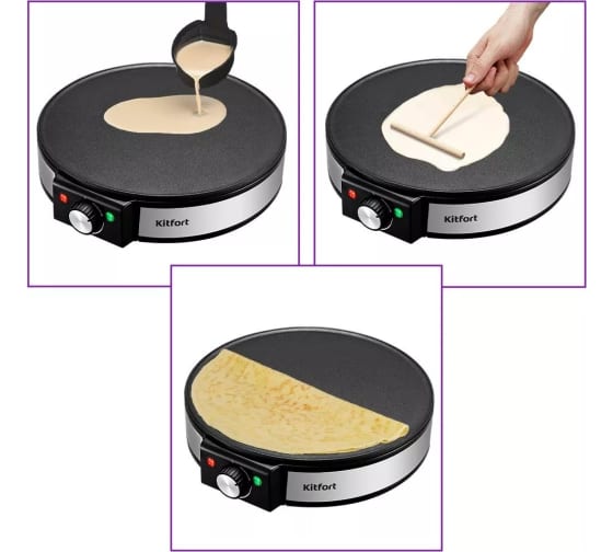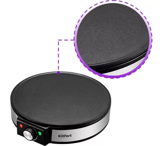 Блинница KITFORT КТ-1678 позволяет быстро испечь блины. Максимальный диаметр блина составляет 30 см. С её помощью также можно приготовить румяные панкейки и оладьи.