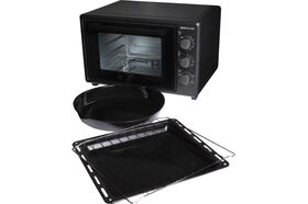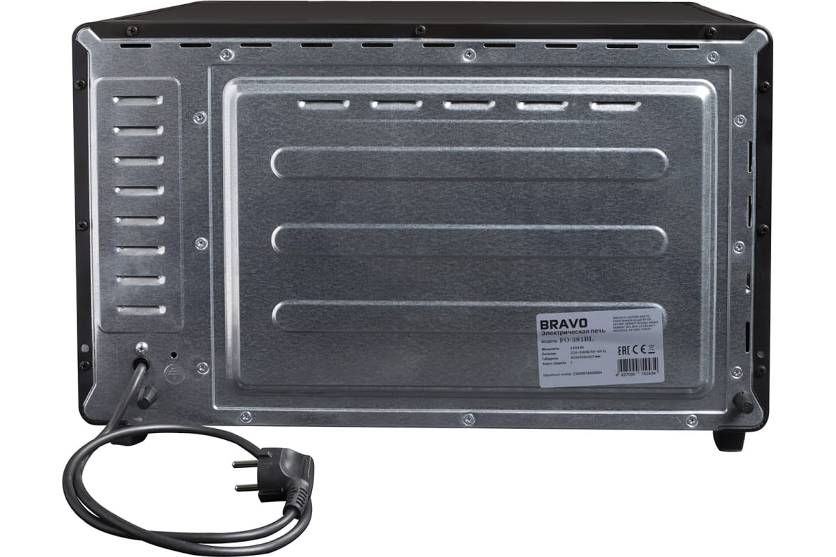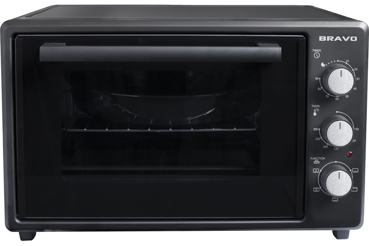 Электрическая мини-печь BRAVO отличается высоким качеством исполнения и стильным дизайном. Полезный объем духовки 38 литров. В комплект входит решетка, прямоугольный эмалированный противень с полезной для использования поверхностью 34 сантиметра по ширине и 30 сантиметров по длине, а также круглый эмалированный противень диаметром 37 сантиметров и глубиной 4,5 сантиметра. Устройство оснащено двумя мощными тэнами по 700 Ватт, диаметром поперечного сечения 1,1 сантиметра. На дверце из закаленного стекла изображены температура и время приготовления блюд из рыбы, мяса, овощей и теста. Электрический кабель на духовке с сечением провода 0,75 мм длиной 85 сантиметров. В базовую комплектацию входит переключатель четырех режимов работы духовки: КОНВЕКЦИЯ+верхний ТЭН+нижний ТЭН, нижний ТЭН, верхний ТЭН и верхний ТЭН+ нижний ТЭН, таймер на 90 минут и термостат с регулировкой температуры от 50 до 300 градусов цельсия. При включении нижнего ТЭН загорается правый световой индикатор, при включении верхнего левый. Одновременно световые индикаторы горят при включении режима работы двух тэнов. По окончании процесса приготовления звучит звуковой сигнал. Эта печь станет украшением для любой, даже небольшой кухни и несомненно порадует своего обладателя качеством приготовленных блюд.