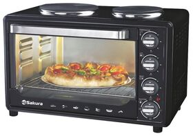 3 режимы работы; размер в упаковке 56.5 х 40.5 х 38.5 см; количество конфорок: 2; количество противней в комплекте: 1