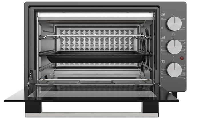 Комплектация мини печь; 1 стандартный эмалированный квадратный противень; 1 решетка; 1 эмалированный круглый противень; документация