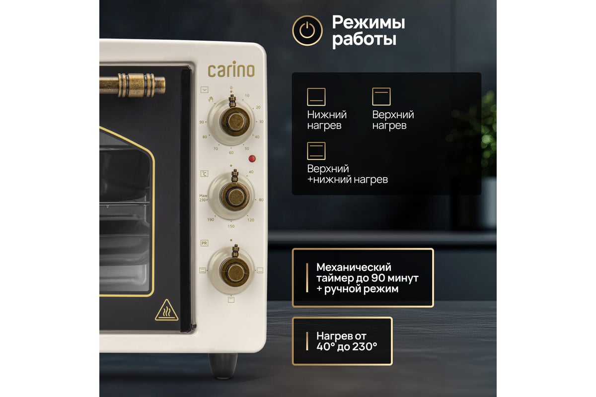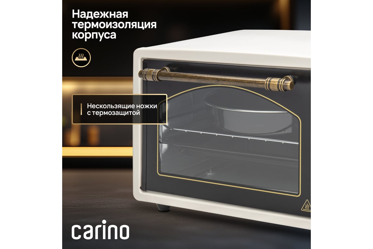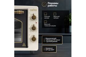 Мини-печь M3417 от бренда CARINO – идеальное решение для тех, кто ценит эффективность и компактность в кухне. С объемом 34 литра и мощностью 1300 Вт, эта печь обеспечивает быстрое и равномерное распределение тепла благодаря возможности выбора режима работы: верхний нагрев, нижний нагрев или их комбинация. Внутреннее покрытие камеры из нержавеющей стали гарантирует долговечность и легкость ухода. Управление механическим способом делает использование печи удобным и интуитивно понятным. Откидная дверца обеспечивает легкий доступ к пище, а максимальная температура до 230 °C позволяет готовить разнообразные блюда. Мини-печь M3417 от CARINO – ваш надежный помощник в кухне, который сочетает в себе качество и практичность.