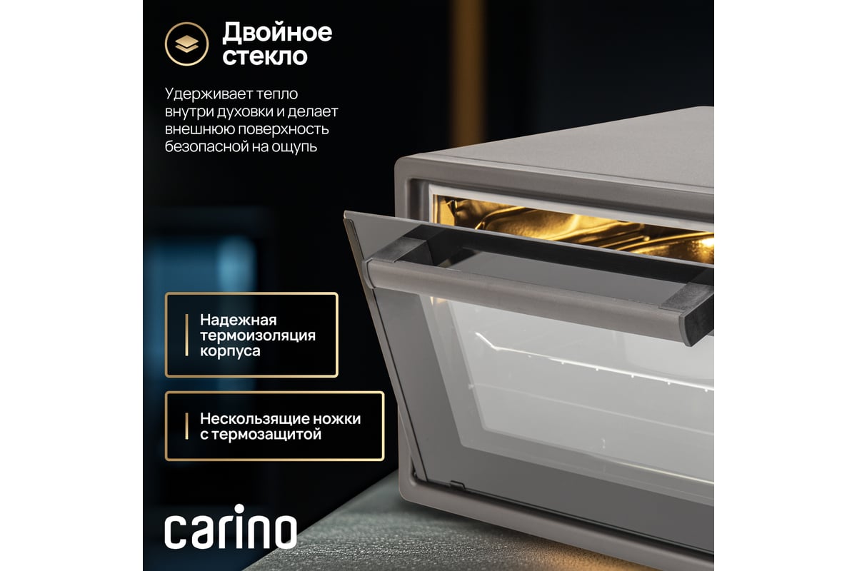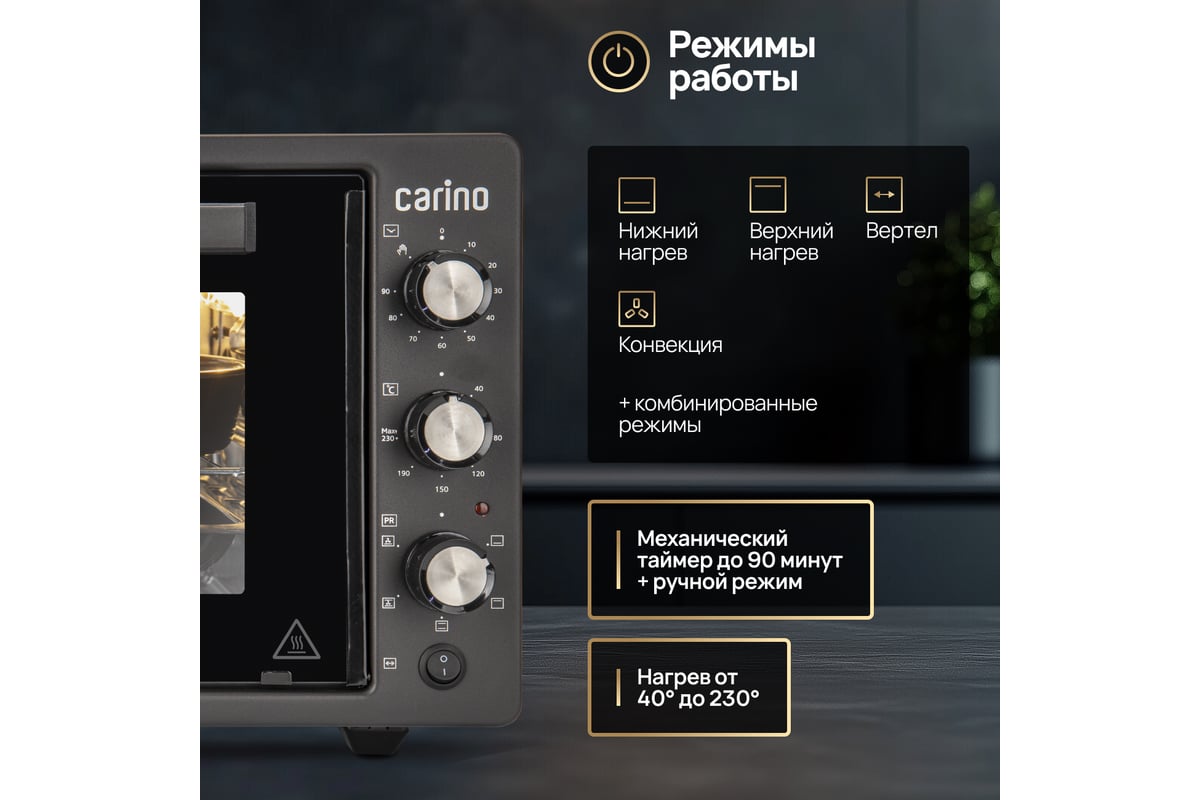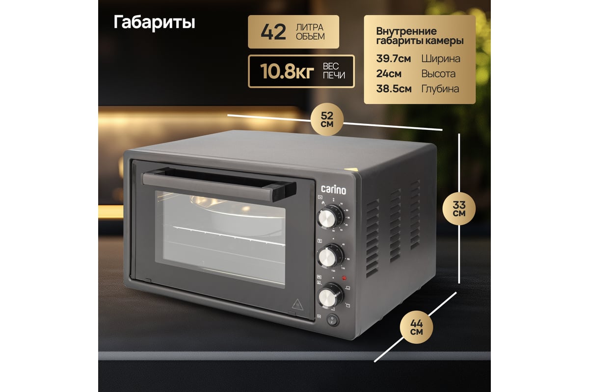 Мини-печь M4226 от бренда CARINO – это компактное и мощное кухонное устройство, идеально подходящее для небольших кухонь или для тех, кто предпочитает экономить пространство. С емкостью 42 литра и мощностью 1300 Вт, эта печь обеспечивает эффективное приготовление блюд благодаря технологии конвекции. Внутреннее покрытие камеры из нержавеющей стали гарантирует легкость ухода за печью и долговечность. Дополнительные опции, такие как внутреннее освещение камеры, таймер с автоотключением и 5 режимов работы, делают процесс приготовления блюд максимально удобным и безопасным. Откидная дверца и максимальная температура до 240 °C позволяют легко контролировать процесс приготовления и достигать идеального результата. Управление механическое, что обеспечивает простоту в использовании. Мини-печь M4226 от CARINO – это отличный выбор для тех, кто ценит качество, эффективность и удобство приготовления блюд.