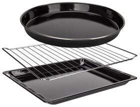 Стандартный противень, круглый глубокий противень, хромированная решетка, инструкция, гарантийный талон.
