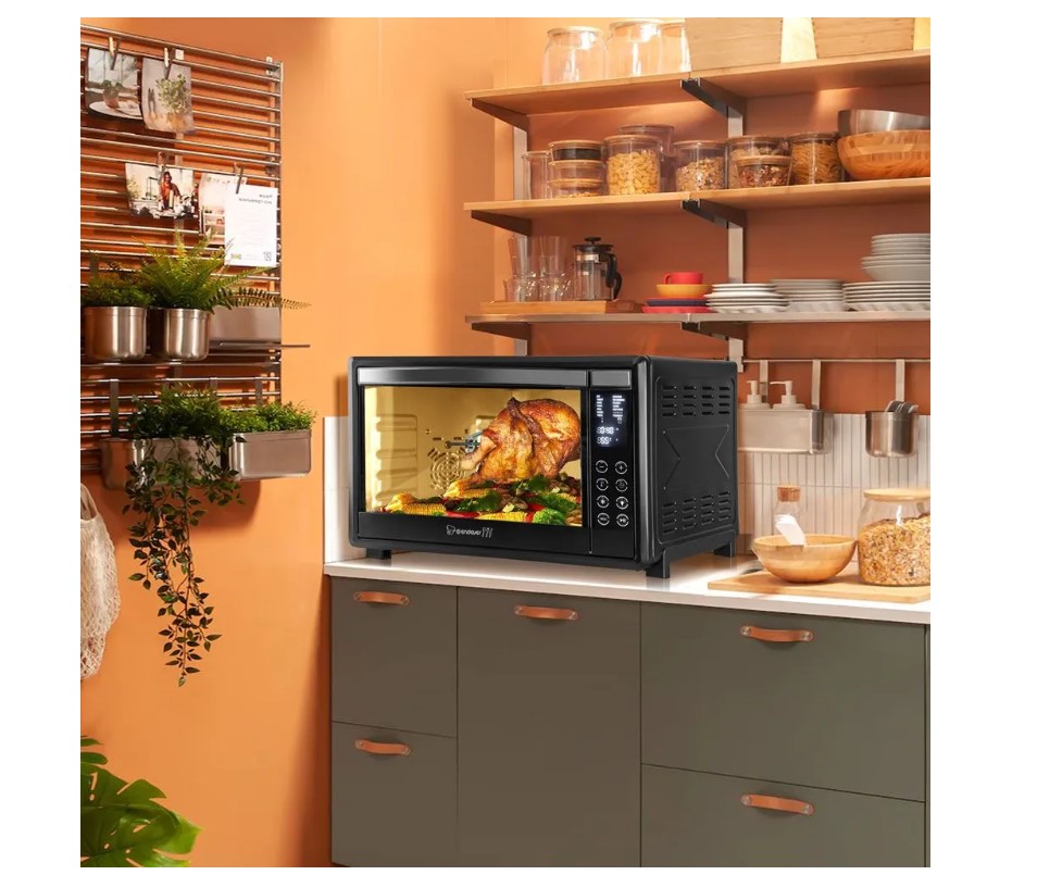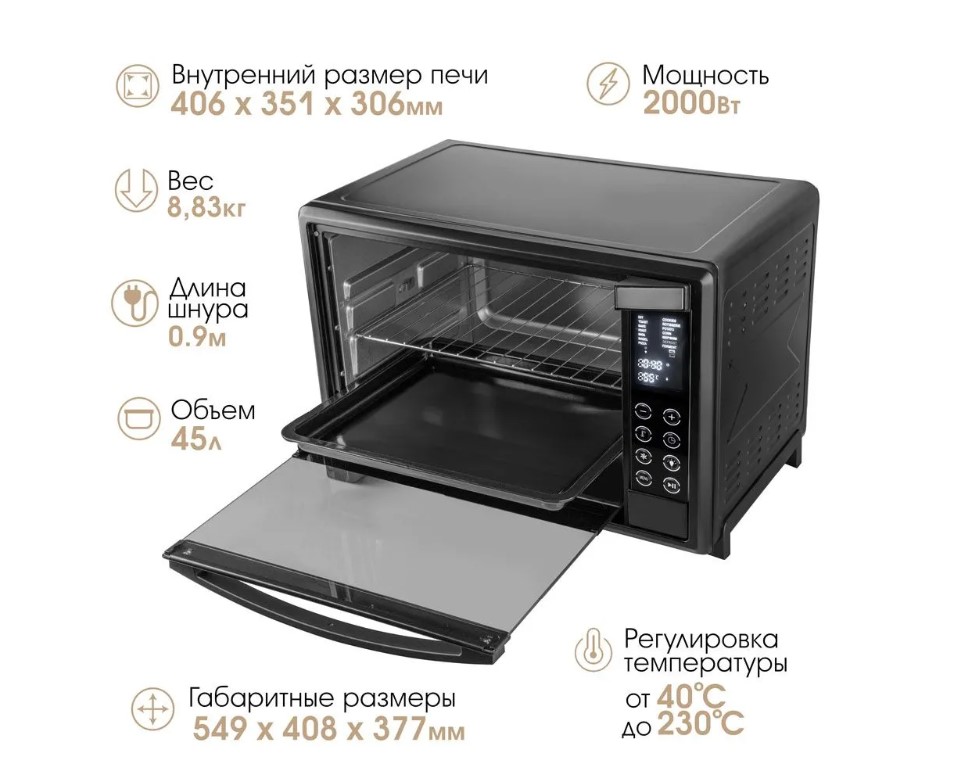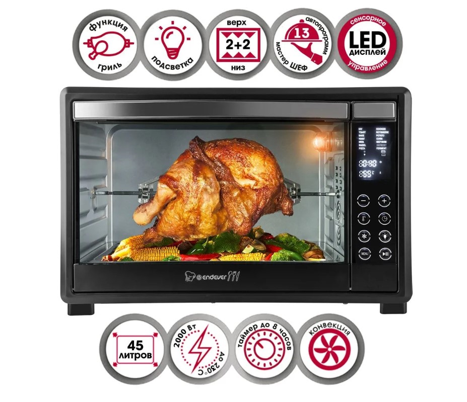 Перед Вами мини-печь ENDEVER Danko-4045 с большим функционалом, которая способна будет приятно удивить Вас и избавить от многих проблем при готовке на Вашей кухне, будь она дома или на даче. Начнем с элегантного внешнего вида в классическом черном цвете со вставками из полированной стали. Управление осуществляется при помощи сенсорных кнопок и LED дисплея, на котором отображается вся необходимая информация. Управление интуитивное и простое, Вы с легкостью разберетесь в нем. Небольшие габариты позволят установить мини-печь в любом месте на Вашей кухне. Прорезиненные ножки способны удержать мини-печь на любой поверхности.