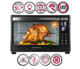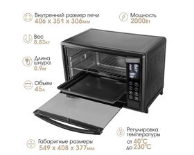 Мини-печь ENDEVER Danko-4045 обладает хорошими техническими характеристиками и большими функциональными возможностями. Мощность составляет 2000 Вт, 4 нагревательных элемента, по два сверху и снизу позволят приготовить быстро и равномерно Ваши блюда. Дополнительно оснащена режимом конвекции и гриля. При объеме 45 литров Вы сможете приготовить солидные по своему размеру блюда из разного вида мяса, в плоть до целых тушек, например курицы или мелкой дичи. Режим гриля позволит равномерно приготовить со всех сторон Ваш кулинарный шедевр. А 13 автоматических программ помогут в этом. Также предусмотрена программа «МАСТЕР ШЕФ», которая предназначена для выбора параметров в ручном режиме, для тех, кто хочет готовить сам по своим рецептам. Регулировка температуры, в зависимости от выбранного режима, от 40 до 230 градусов. Наличие внутренней подсветки облегчит Вам контроль за процессом приготовления. Таймер работы до 8 часов с функцией автоотключения и звуковым сигналом позволит установить оптимальное время приготовления и всегда предупредит о готовности блюда.