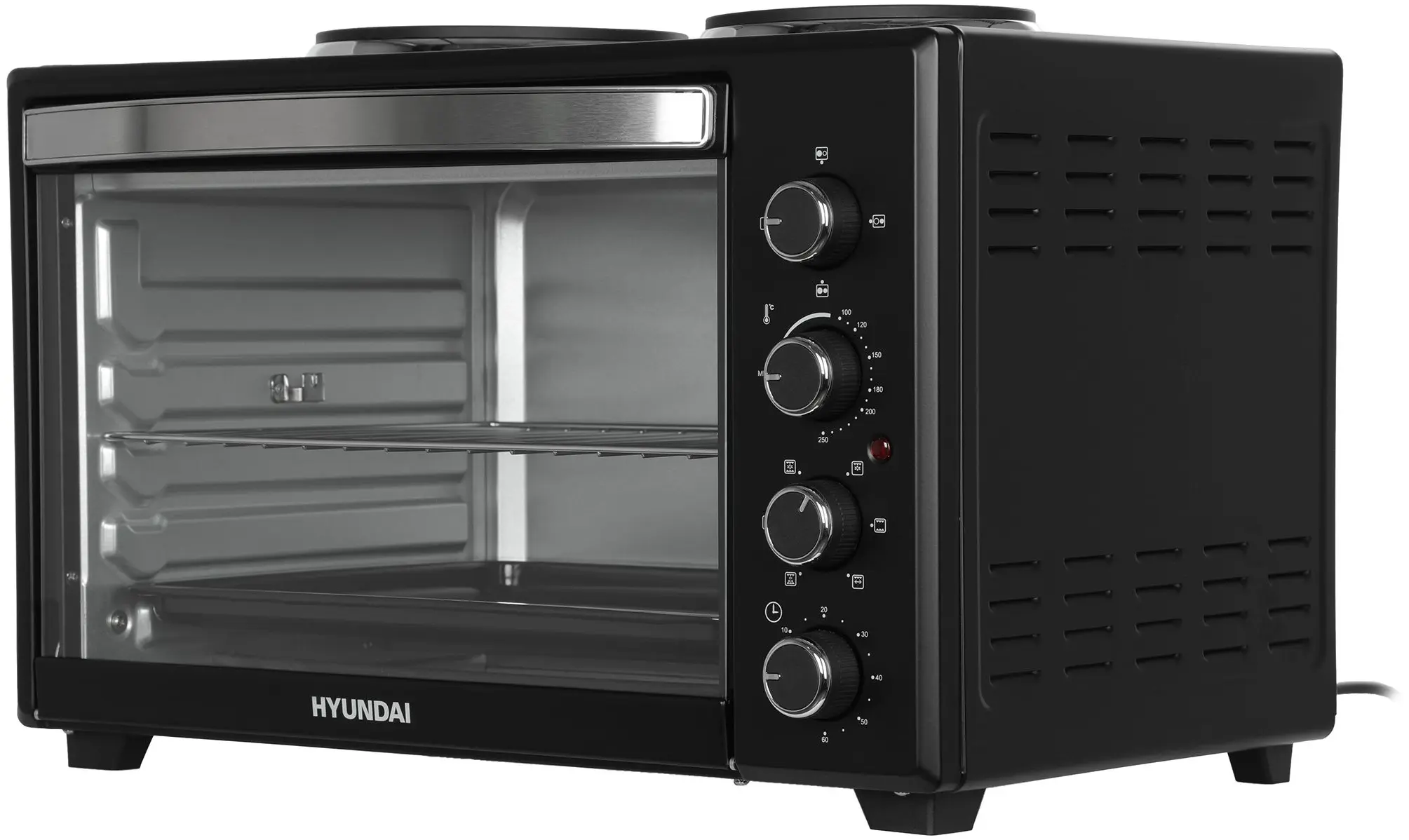 Модель Hyundai MIO-HY099 сочетает в себе функциональность электроплитки, гриля, электрической духовки и тостера. Пользуйтесь одновременно и двумя электрическими конфорками, и мини-печью, чтобы сделать сразу несколько блюд для всей семьи.