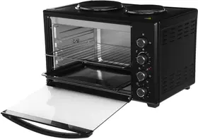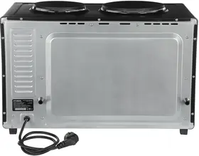 две конфорки 1000 Вт и 600 Вт, печь две конфорки 1000 Вт и 600 Вт, печь может работать одновременно как мини-печь, используя все функции, так и конфорки. Большая ручка из нержавеющей стали.