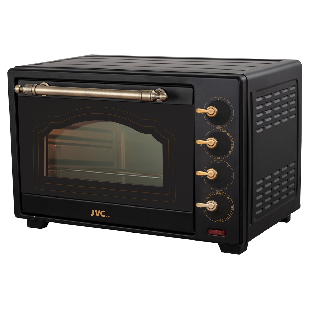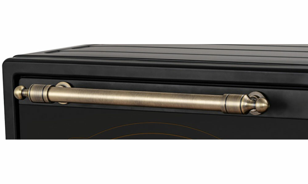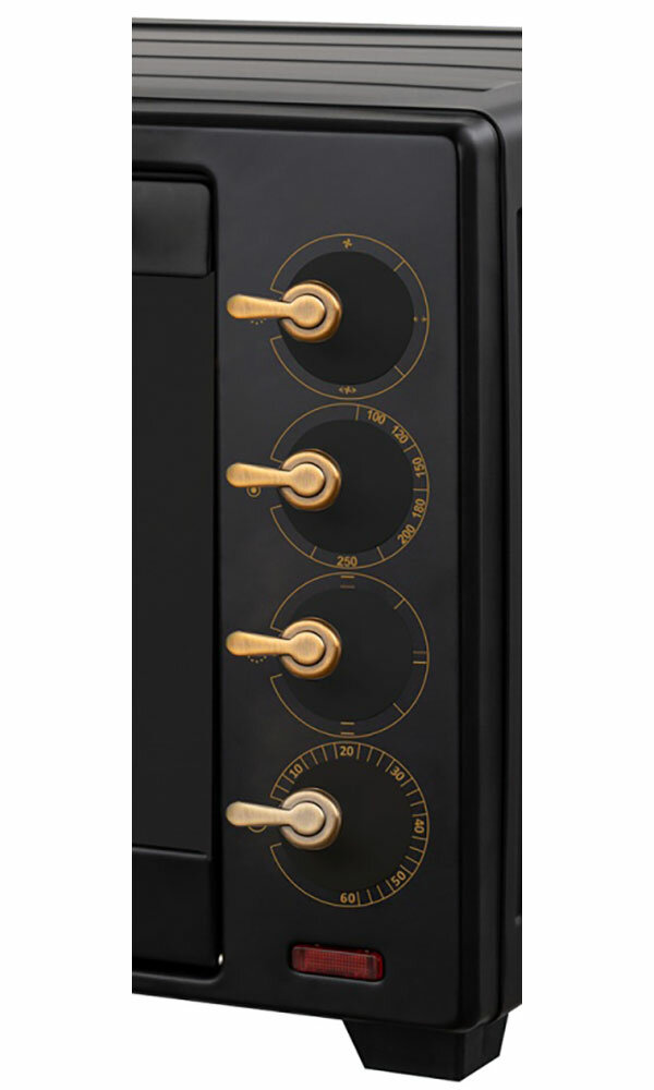 электропечь, металлическая решетка, плоский противень, ухват для противня, круглый противень для пиццы, вертел для гриля, ухват для вертела, насадка для приготовления шашлыка/кебаба, поддон для крошек, гарантийный талон, инструкция на русском языке