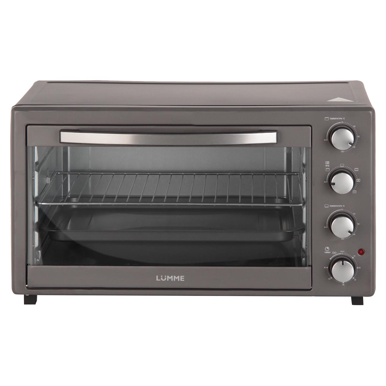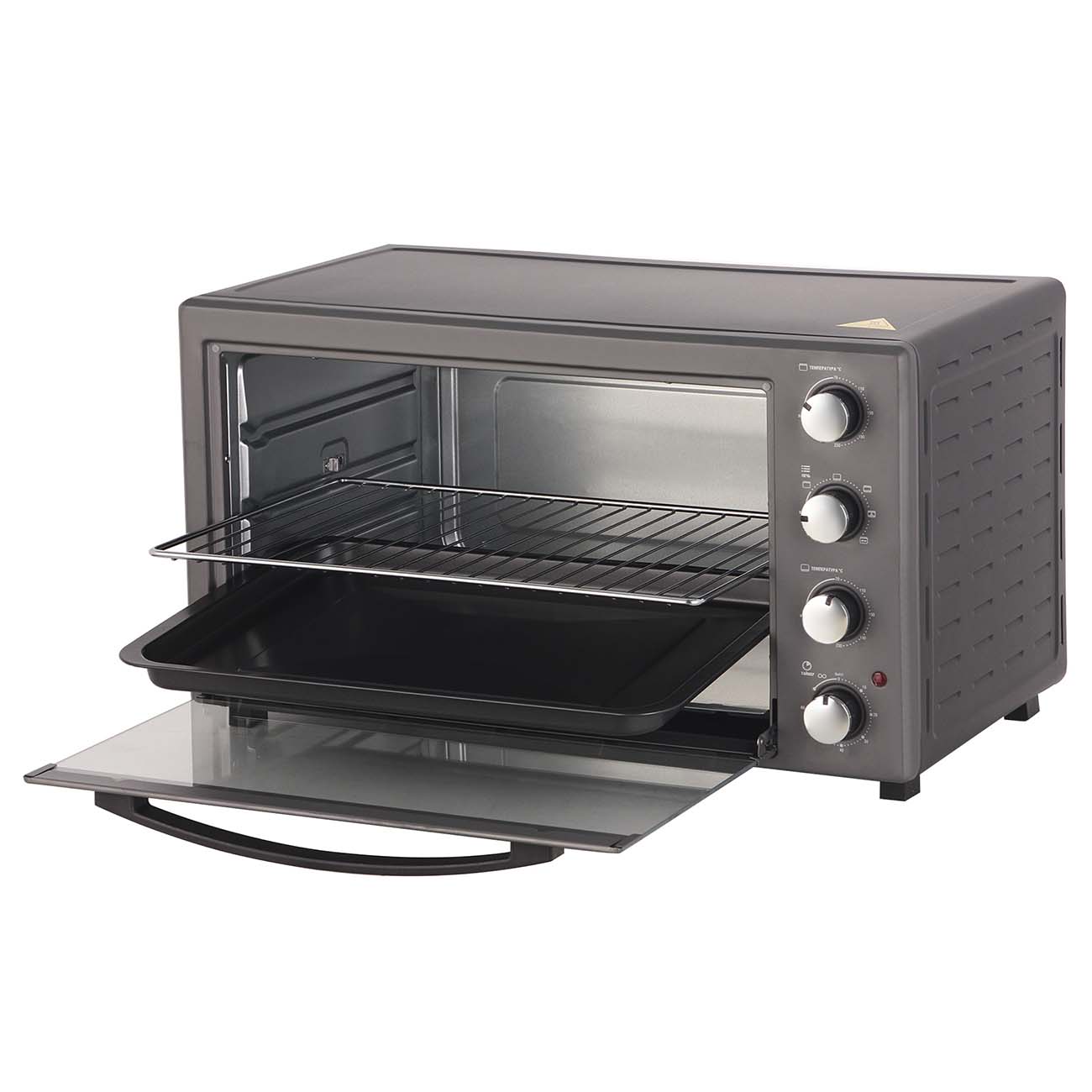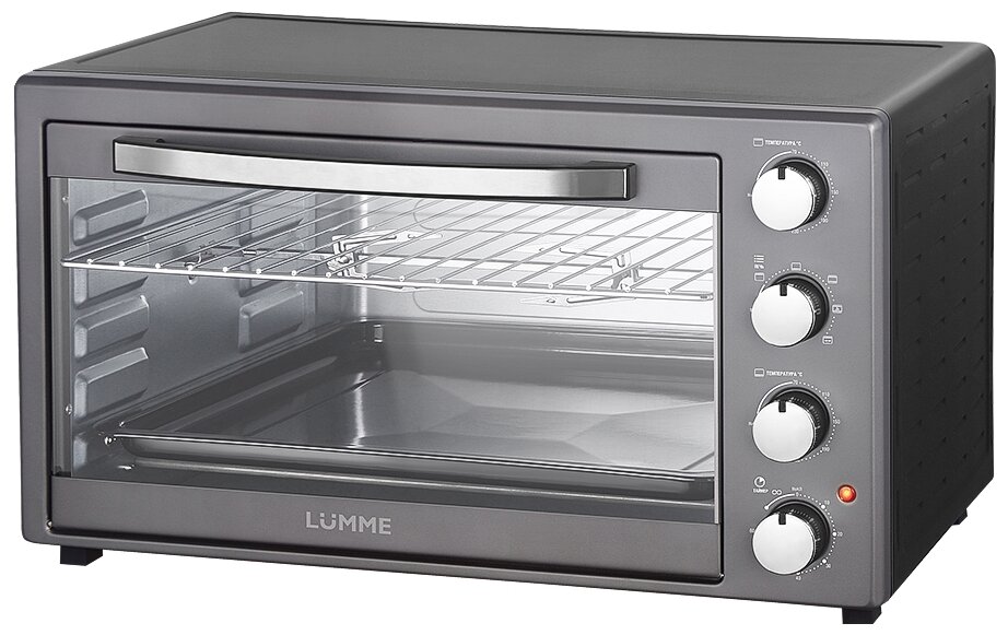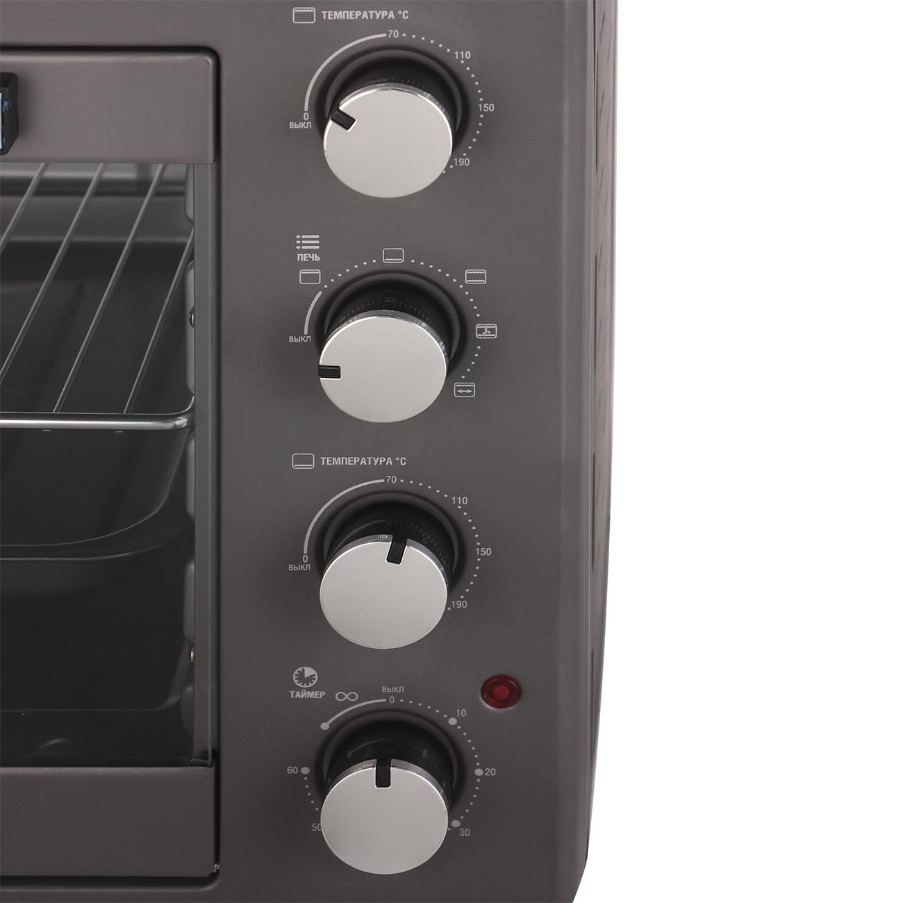 сигнал об окончании приготовления, дверца из закаленного стекла, световой индикатор работы; независимая механическая регулировка температуры верхних и нижних нагревательных элементов; ручка для вертела в комплекте; количество противней в комплекте: 1