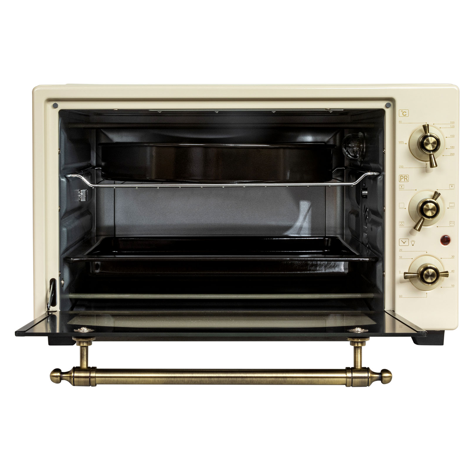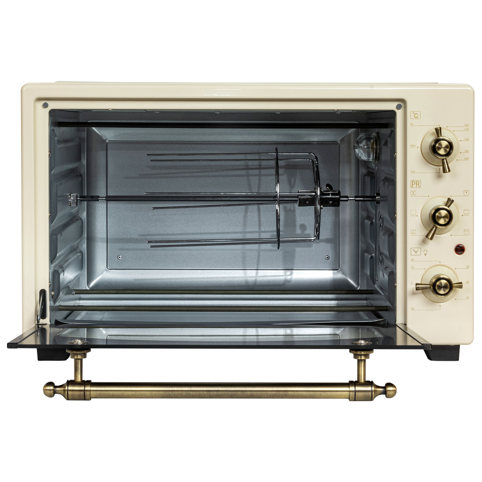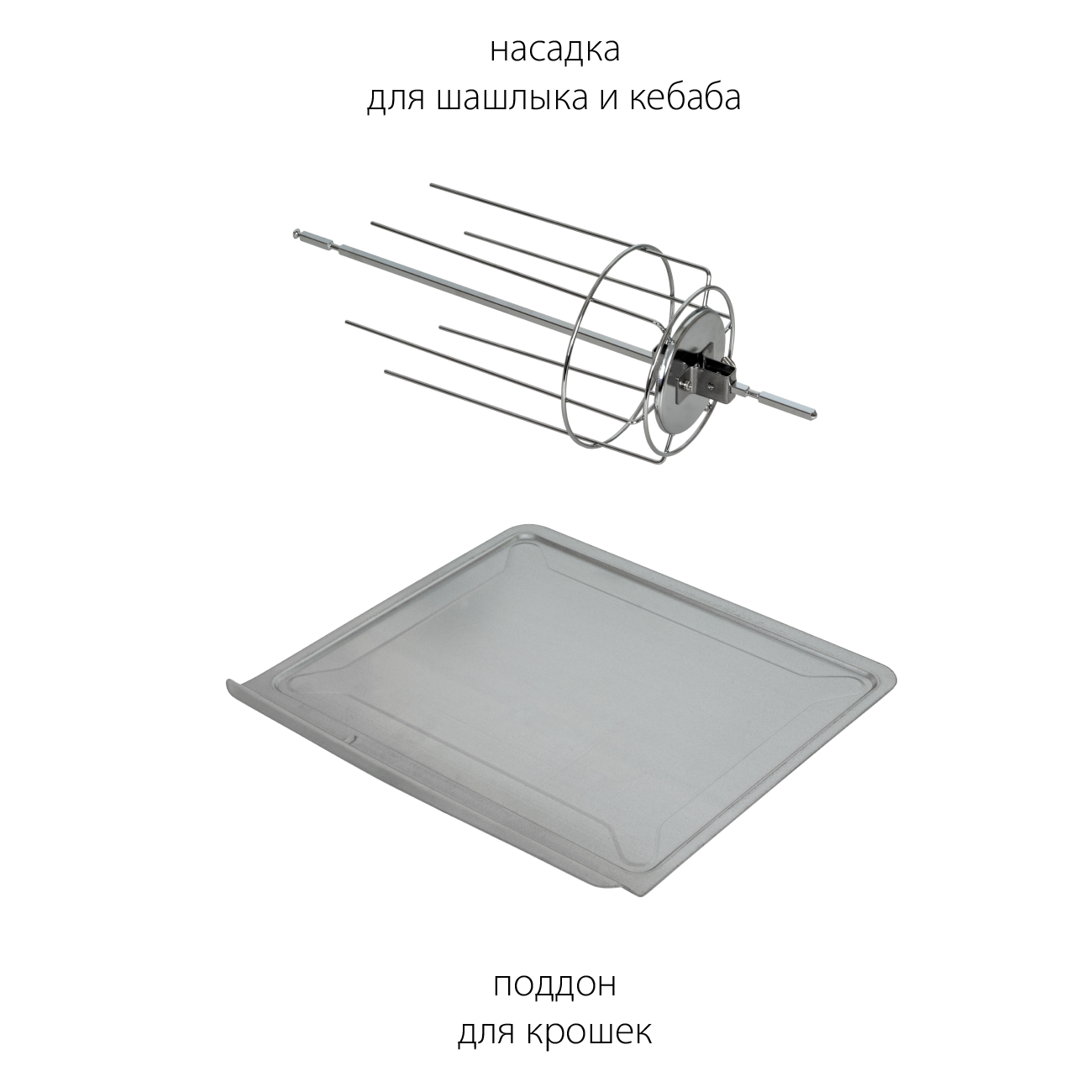 Комплектация: электропечь, решетка, противень для запекания, поддон для крошек, форма для пиццы, насадка для шашлыка/кебаба, ухват для противня, вертел, держатель для вертела, инструкция на русском языке