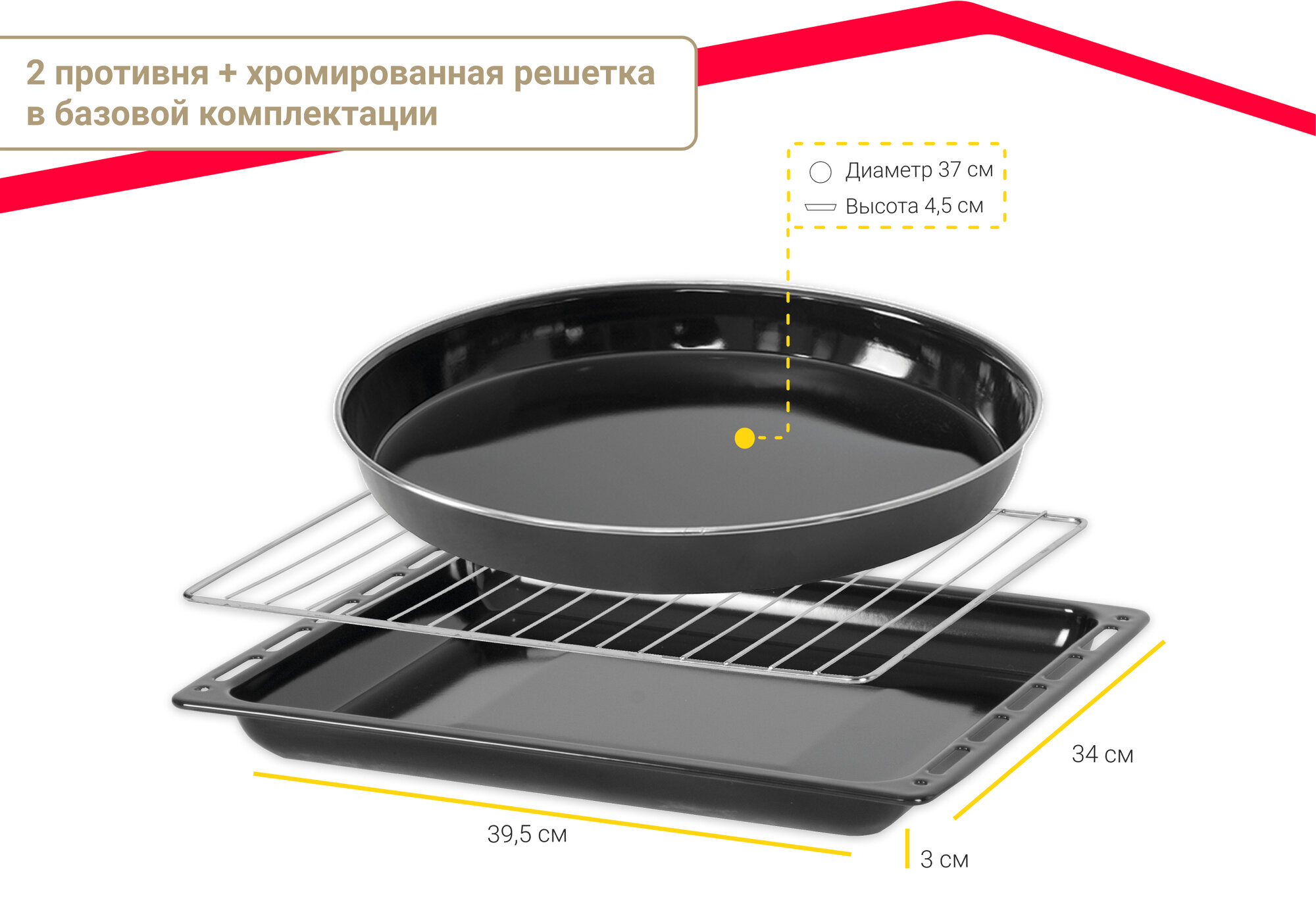 Механическое управление, включая механический таймер и термостат, делает печь удобной и интуитивно понятной в использовании. Поворотные переключатели обеспечивают удобную регулировку температуры и времени приготовления, в то время как прозрачная дверца из стекла позволяет наблюдать за процессом приготовления без необходимости открывать печь, сохраняя тем самым тепло и аромат блюд.