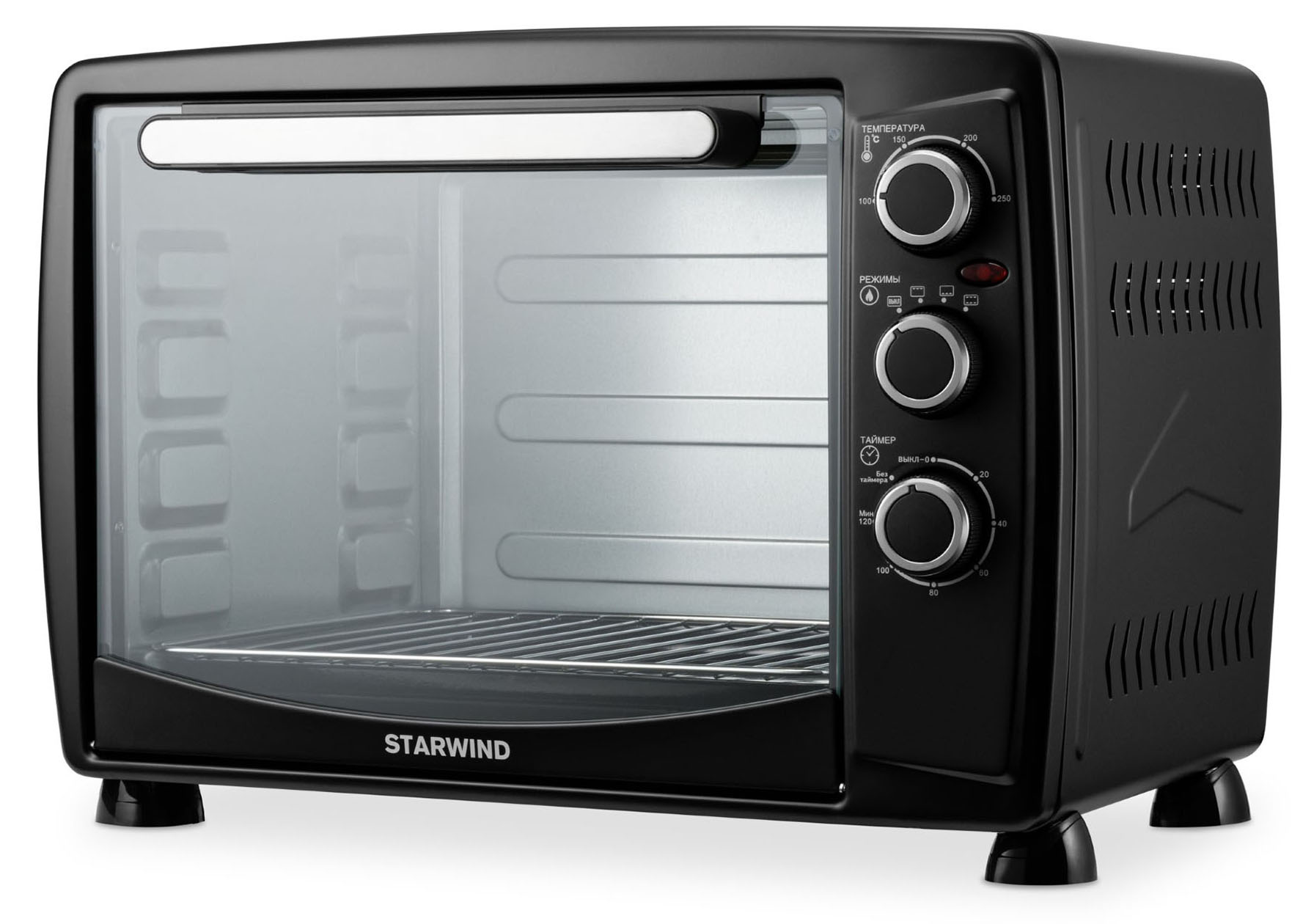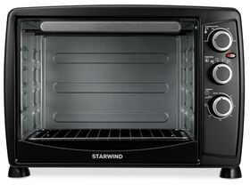 Вместительная мини-печь StarWind SMO2045 черного цвета обладает объемом 35 литров. За счет этого в ней можно готовить пищу для большой компании. Прибор порадует простым управлением и предсказуемым результатом приготовления. Управлять устройством можно при помощи механических ручек круглой формы. Настройка температуры осуществляется в диапазоне 100-250 градусов. Бытовая техника оснащена 3 режимами, каждый из которых обеспечивает качественное приготовление пищи в соответствии с заданной пользователем температурой. В комплекте имеются противень, съемная решетка и съемная ручка для поддона.