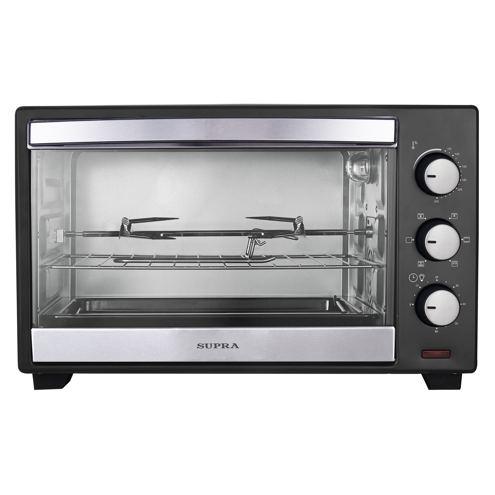 электропечь, металлическая решетка, плоский противень, круглая форма для пиццы, ухват для противня, вертел, ухват для вертела, инструкция на русском языке