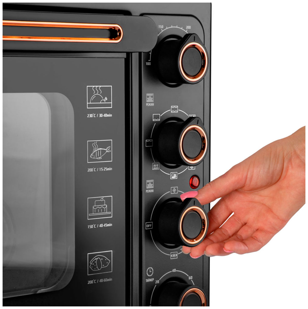 Регулировка температуры от 100 до 250 градусов и таймер на 120 минут с функцией автоотключения и звуковым сигналом делают использование печи удобным и безопасным.