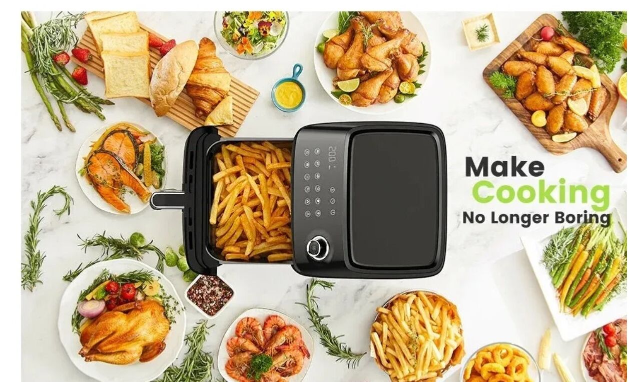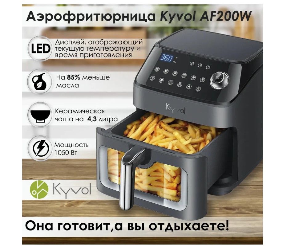 Kyvol AF200W - высокотехнологичная фритюрница которая заботится о вашем здоровье. С помощью высокоскоростной циркуляции раскаленного воздуха AF200W готовит без добавления масла. Это позволяет продуктам сохранить свои полезные свойства, сократить количество жира на 85%. А также значительно уменьшить содержание нитратов в пище. В данной модели вы без труда приготовите куриные крылышки, картошку фри, шашлык, креветки и многое другого.