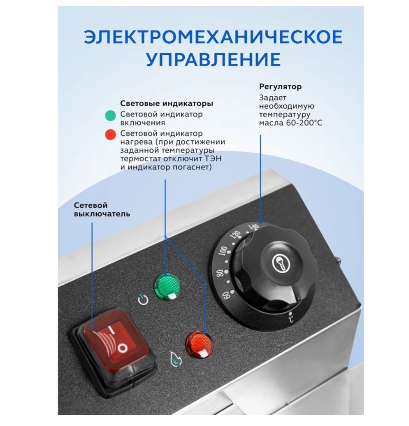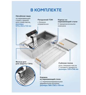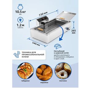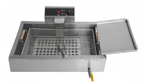 Электрическая фритюрница-чебуречница GASTRORAG CZG-EF-16L - это техника для профессиональной кухни, предназначенная для жарки в масле чебуреков, пирожков, пончиков и т.п. От обычной фритюрницы чебуречница отличается неглубоким и широким котлом, в котором удобно размещать и обжаривать чебуреки в один слой. Несъемный котел с краном для слива масла изготовлен из нержавеющей стали, имеет внутренние размеры 670х322х132 мм, объем масла при заполнении до максимальной отметки составляет 16 л, разовая загрузка в зависимости от размера чебуреков составляет от 6 до 12 шт. В комплект поставки фритюрницы входит сетчатая корзина размером 580х283х104 мм с 2 деревянными ручками, фальш-дно для защиты ТЭНа от контакта с корзиной и съемная полка размером 350 х 346 мм для стекания масла с готового продукта. ТЭН с блоком управления легко снимается для очистки и обслуживания. Фритюрный шкаф имеет электромеханическое управление, рабочая температура плавно регулируется в диапазоне 60-200оС. Корпус фритюрницы для чебуреков изготовлен из нержавеющей стали.